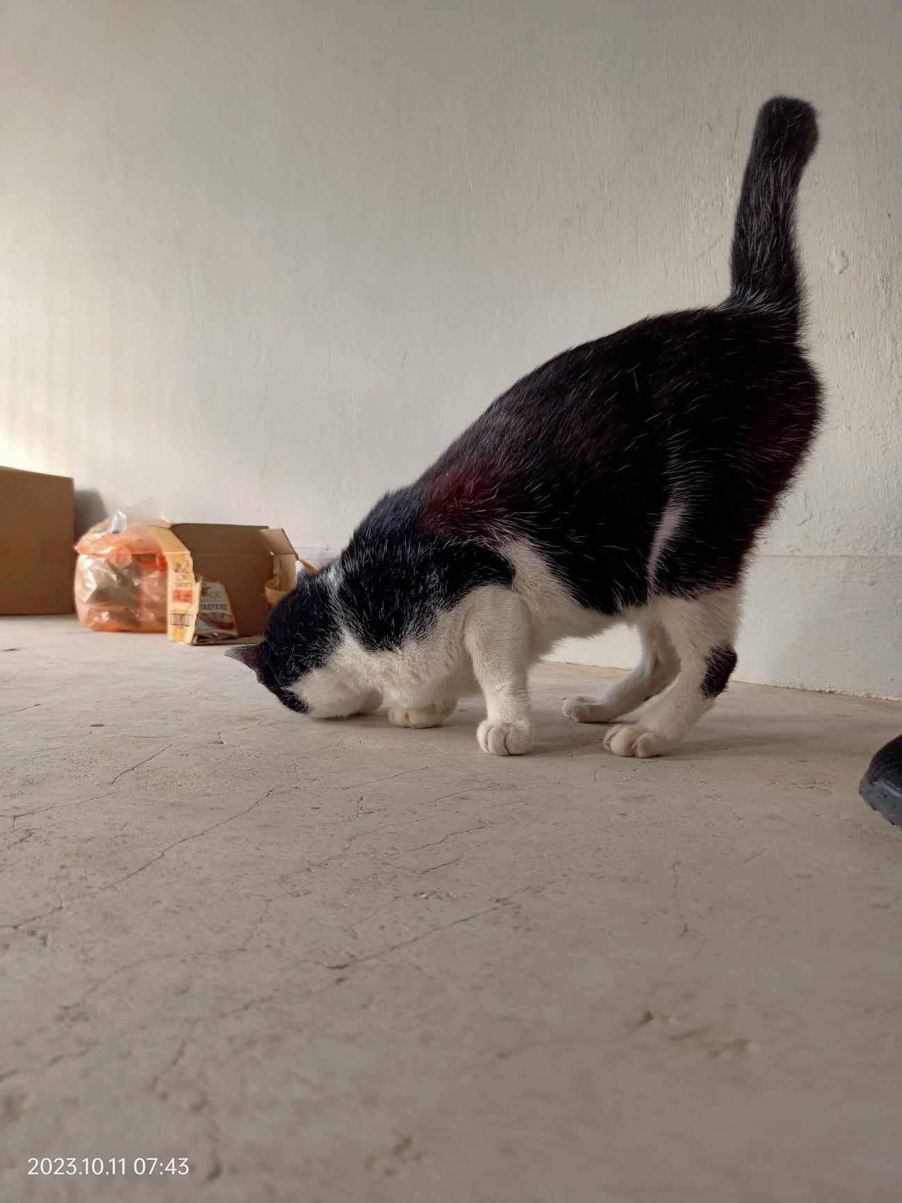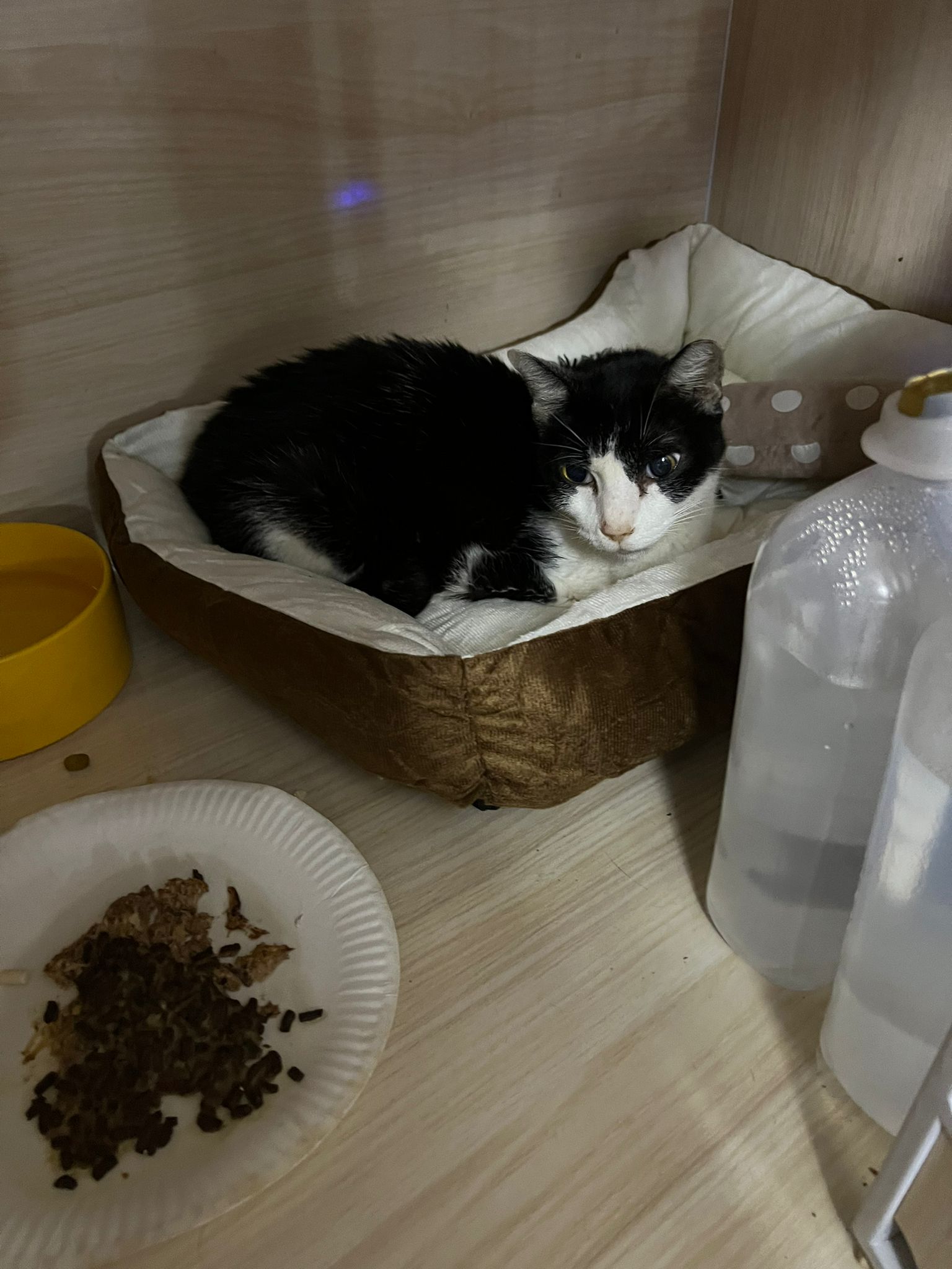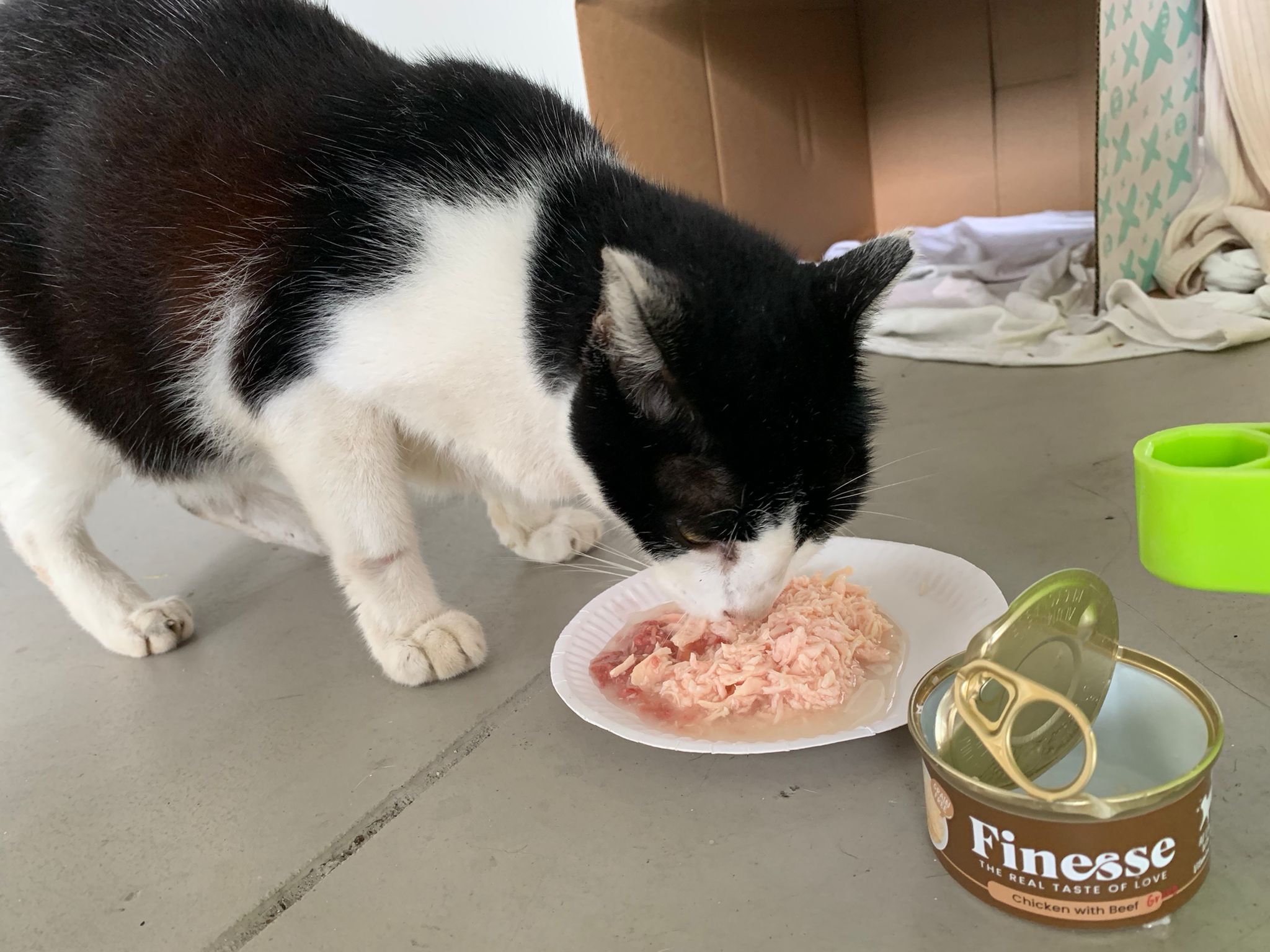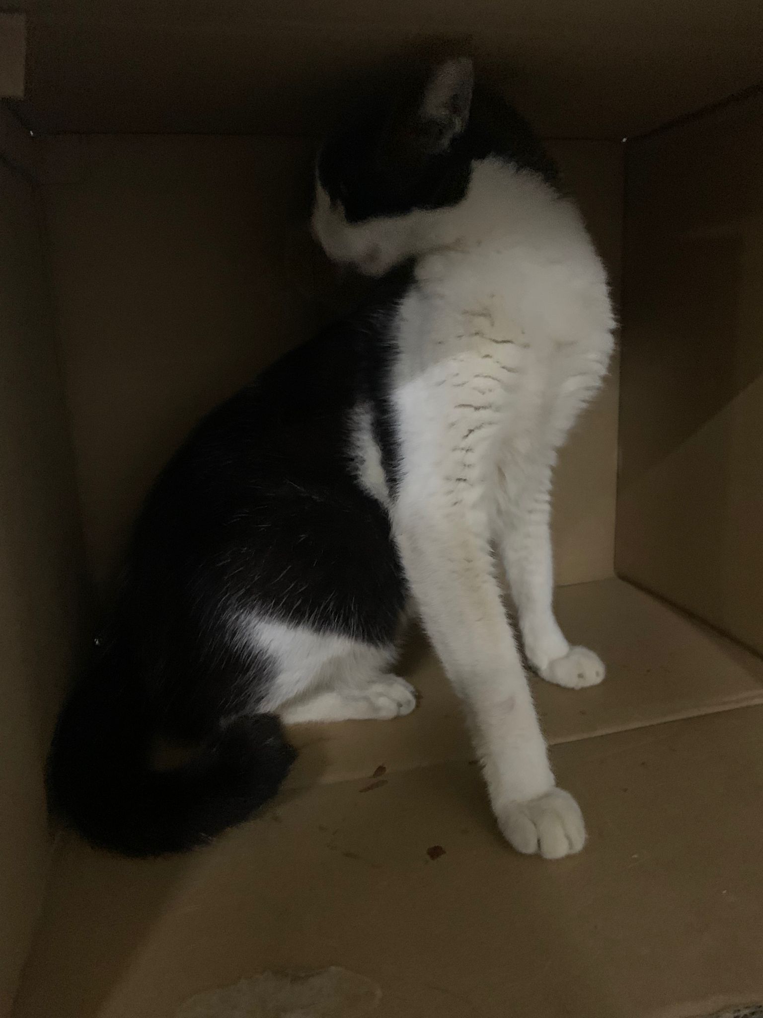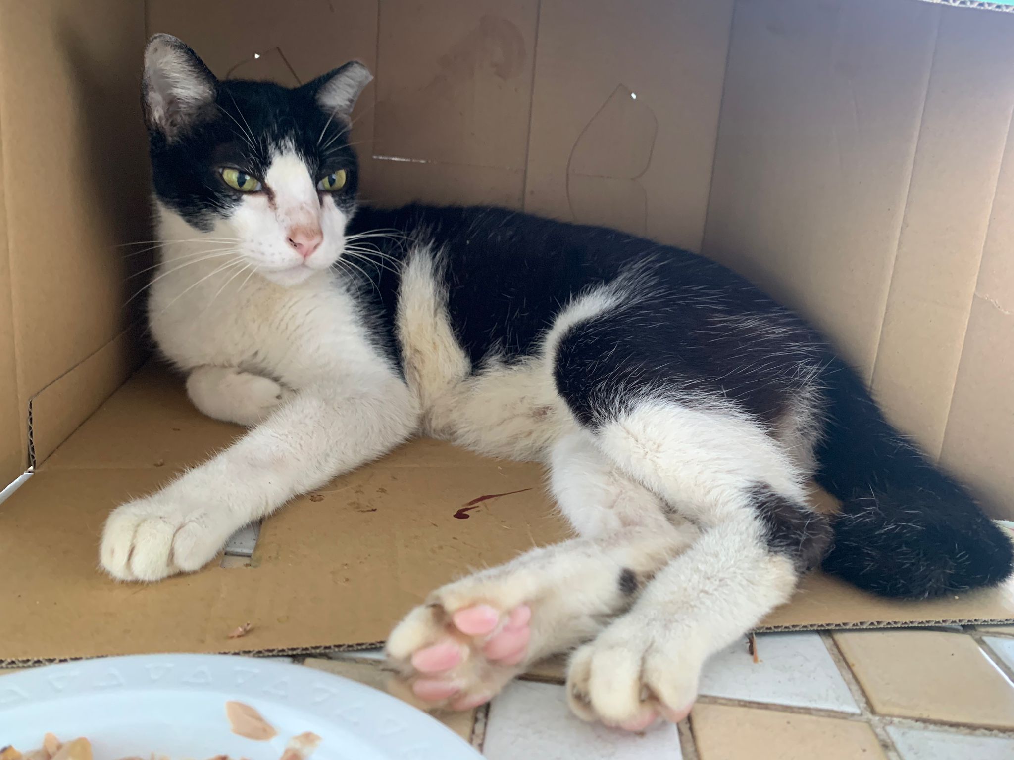 10pm+: super cute, xiao Lian like to hide and sleep in box too. Someone left a box for him to sleep in. My kibble bowl is back 🙂 I top up more kibble for him 🙂 sayang him a lot.