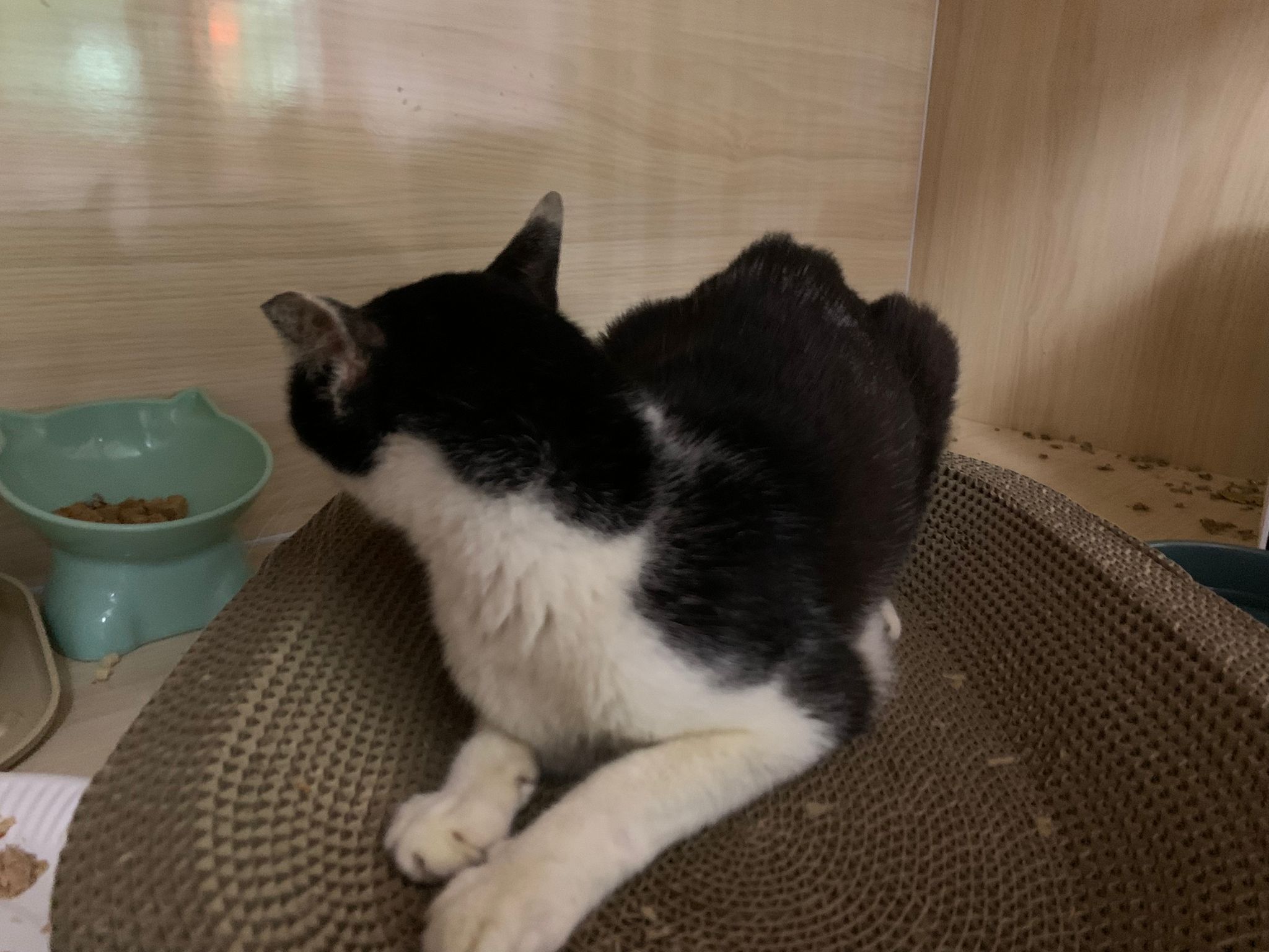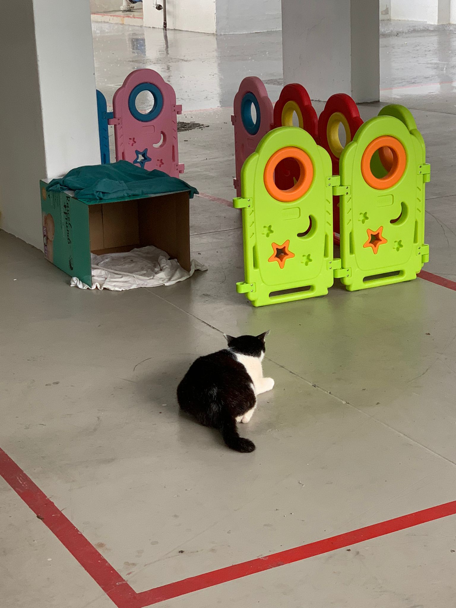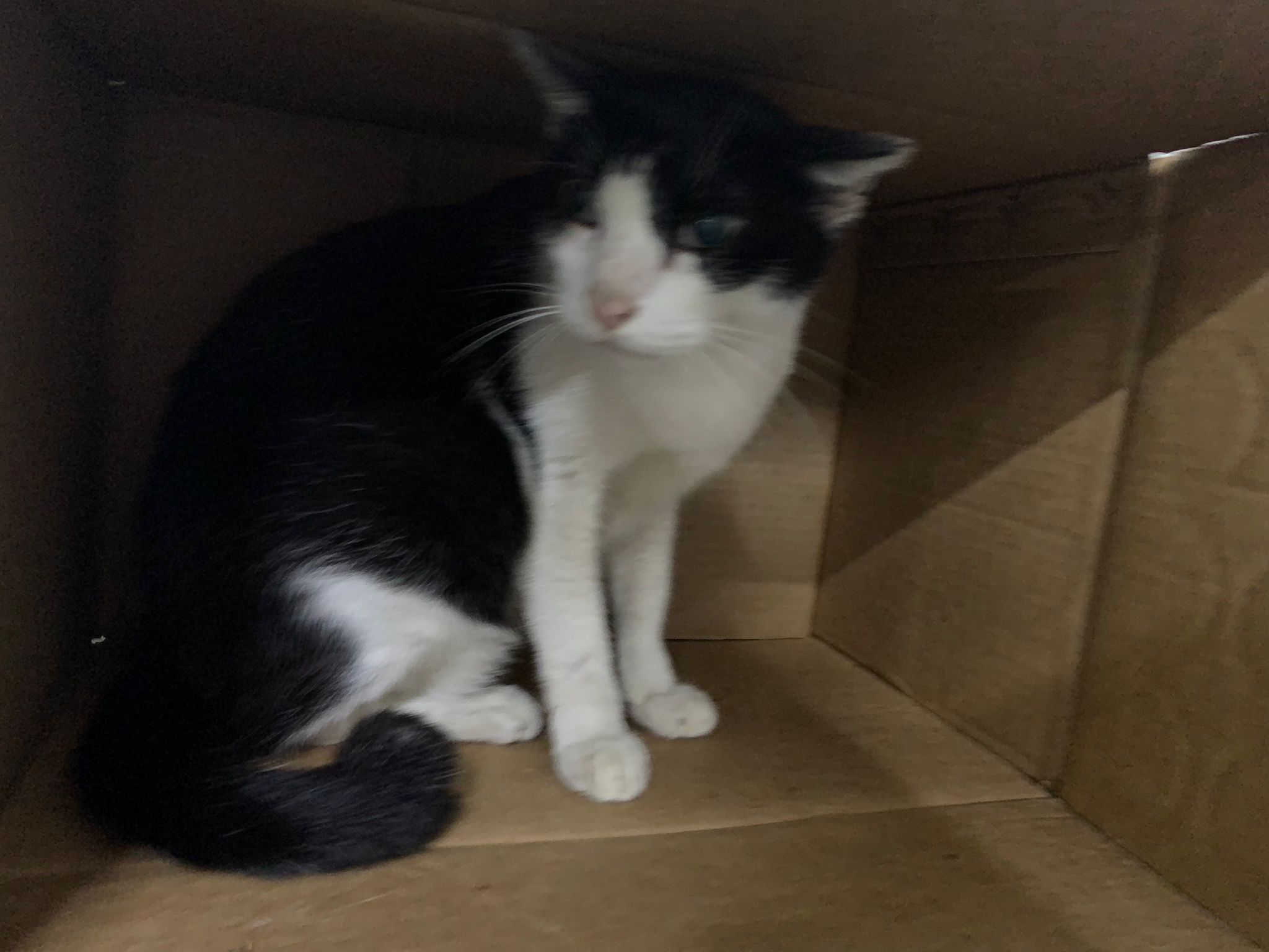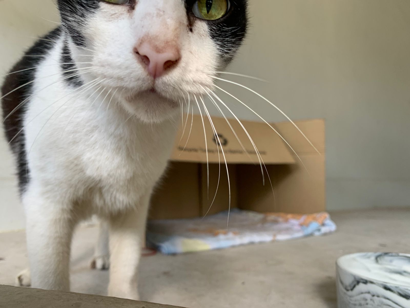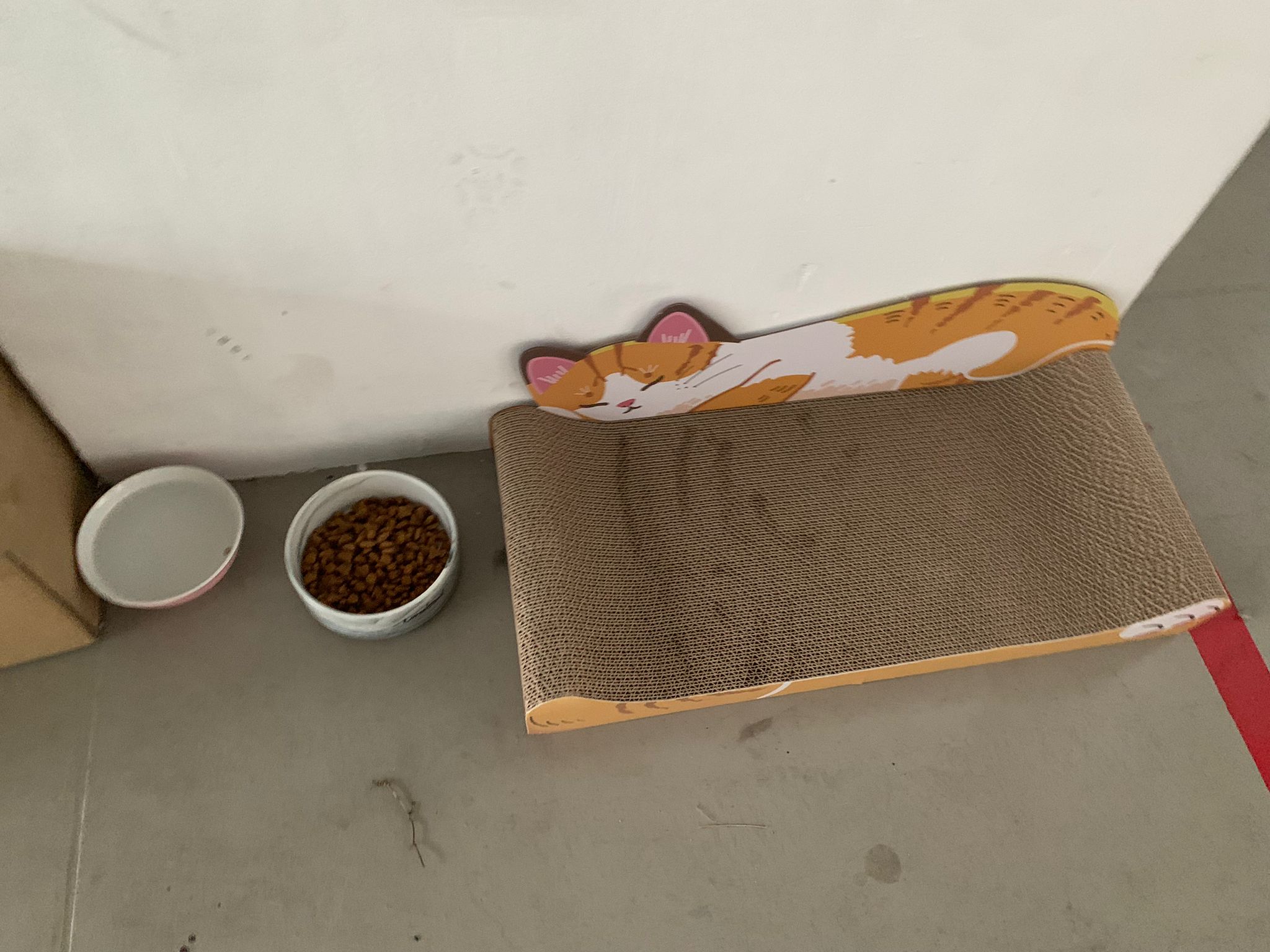 10pm+: super cute, xiao Lian like to hide and sleep in box too. Someone left a box for him to sleep in. My kibble bowl is back 🙂 I top up more kibble for him 🙂 sayang him a lot.