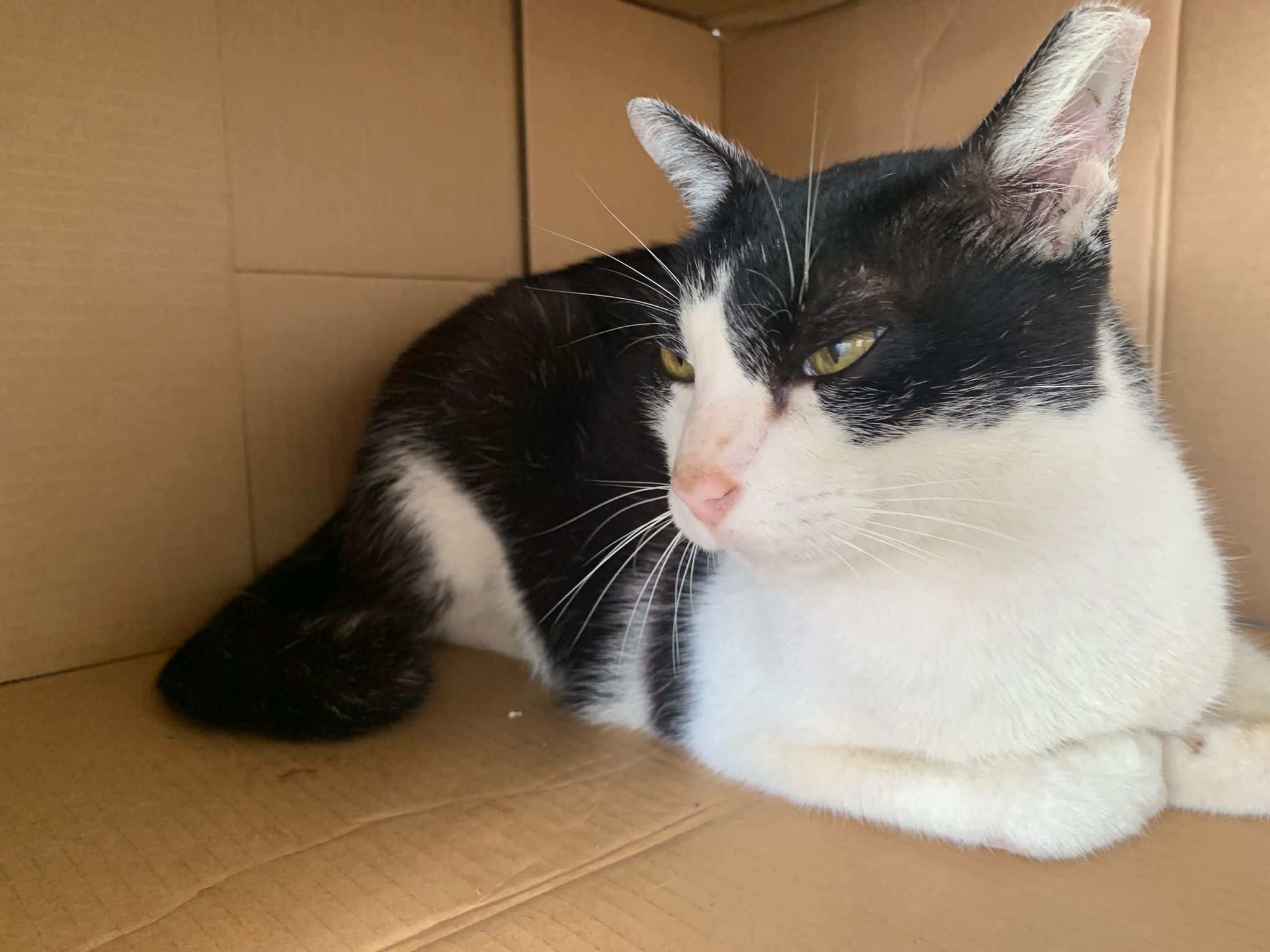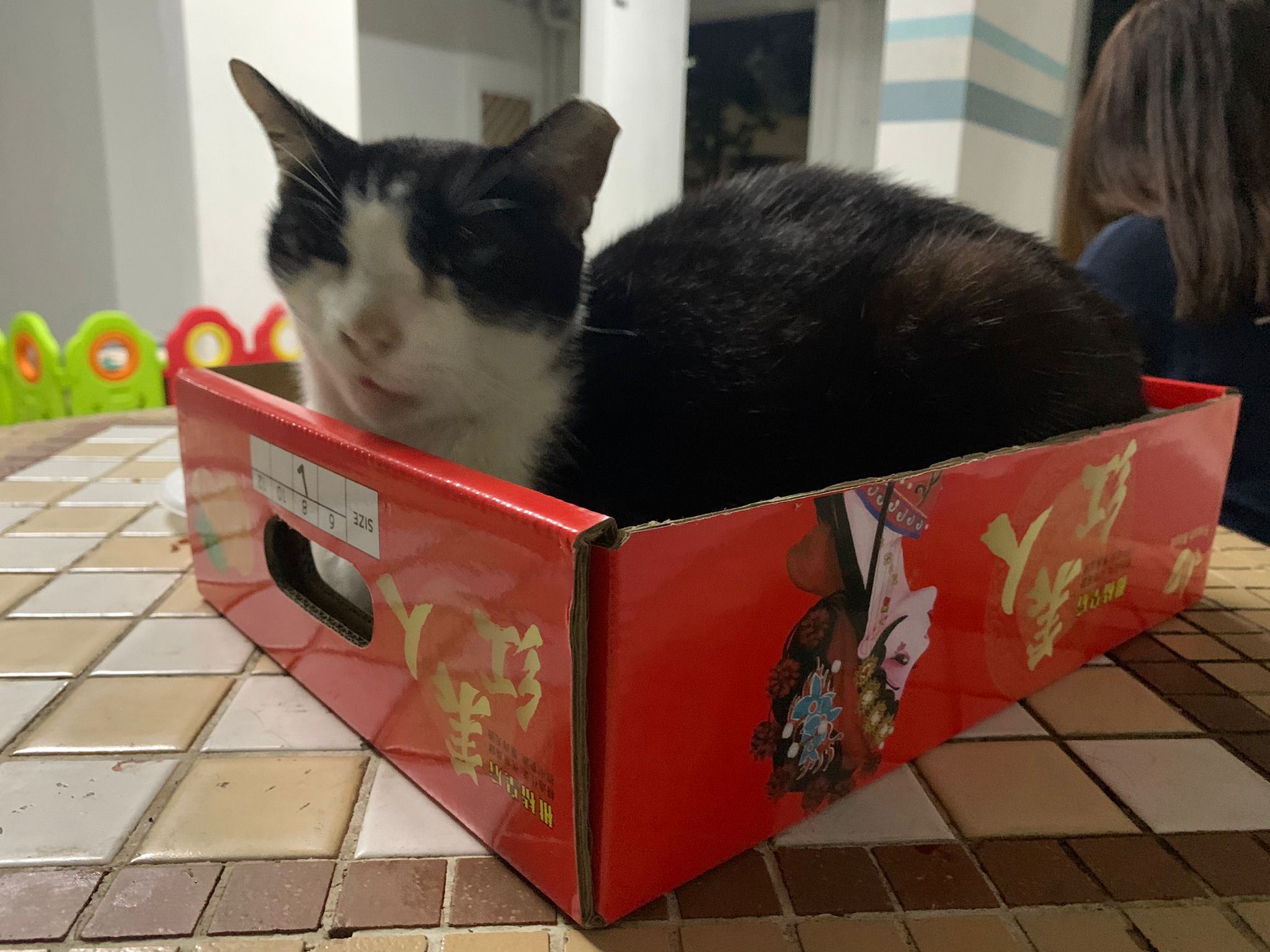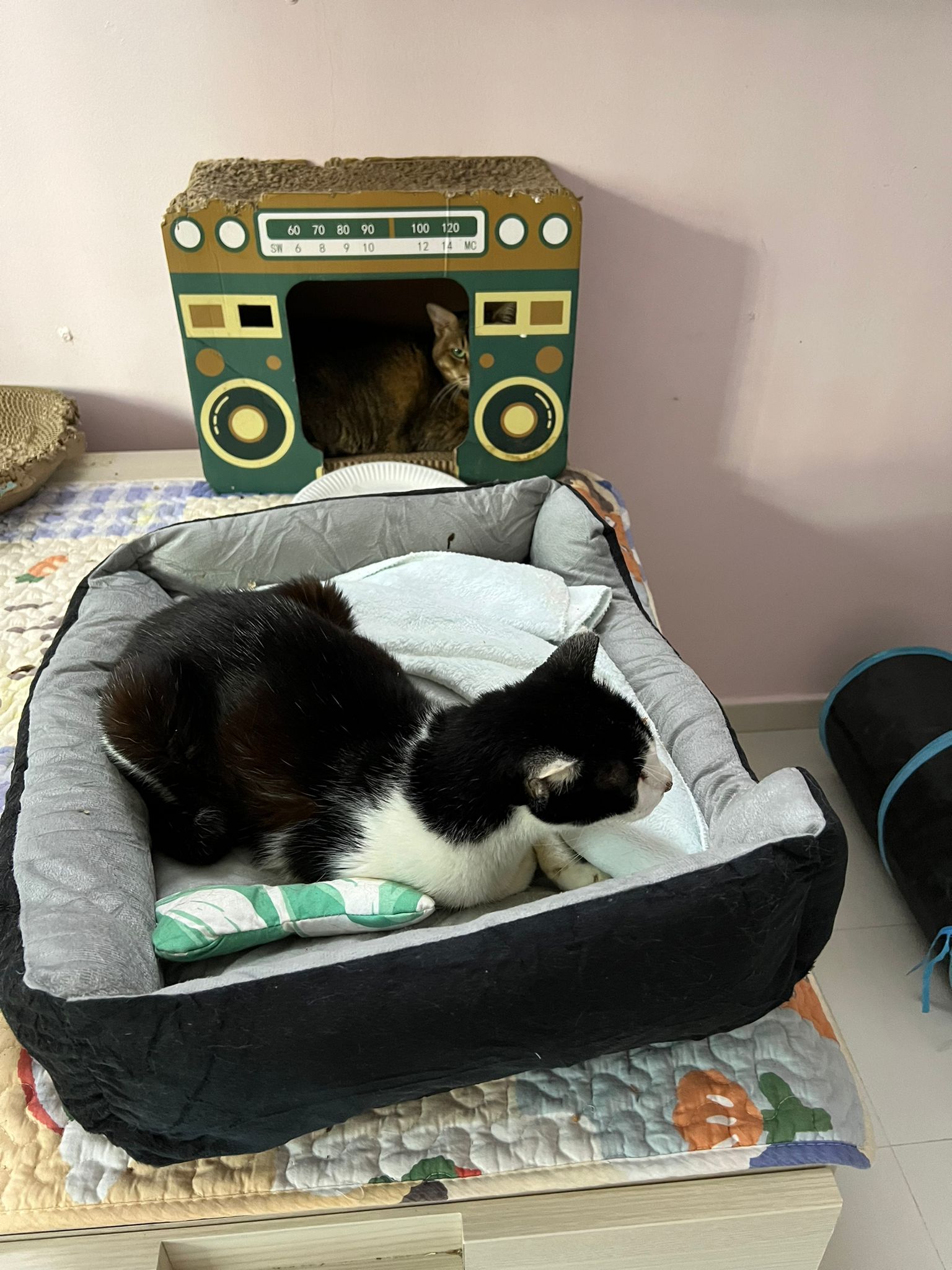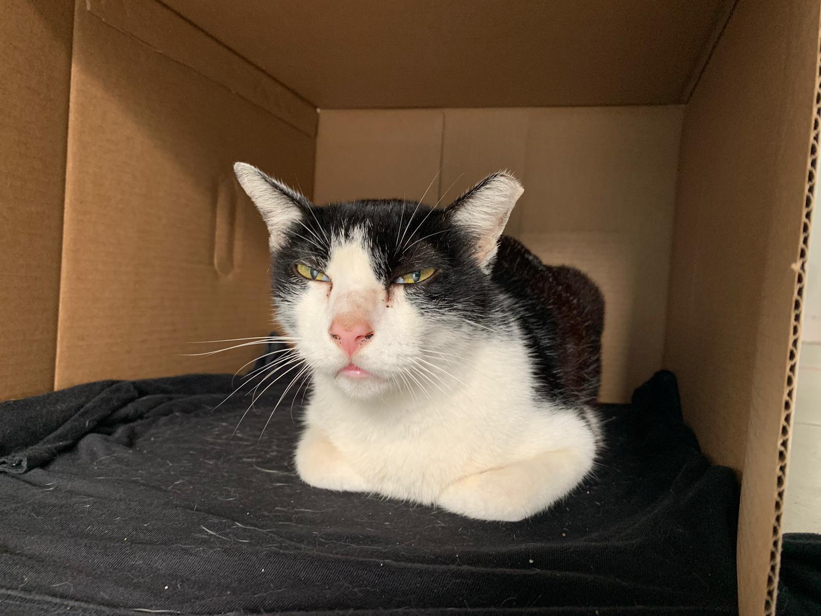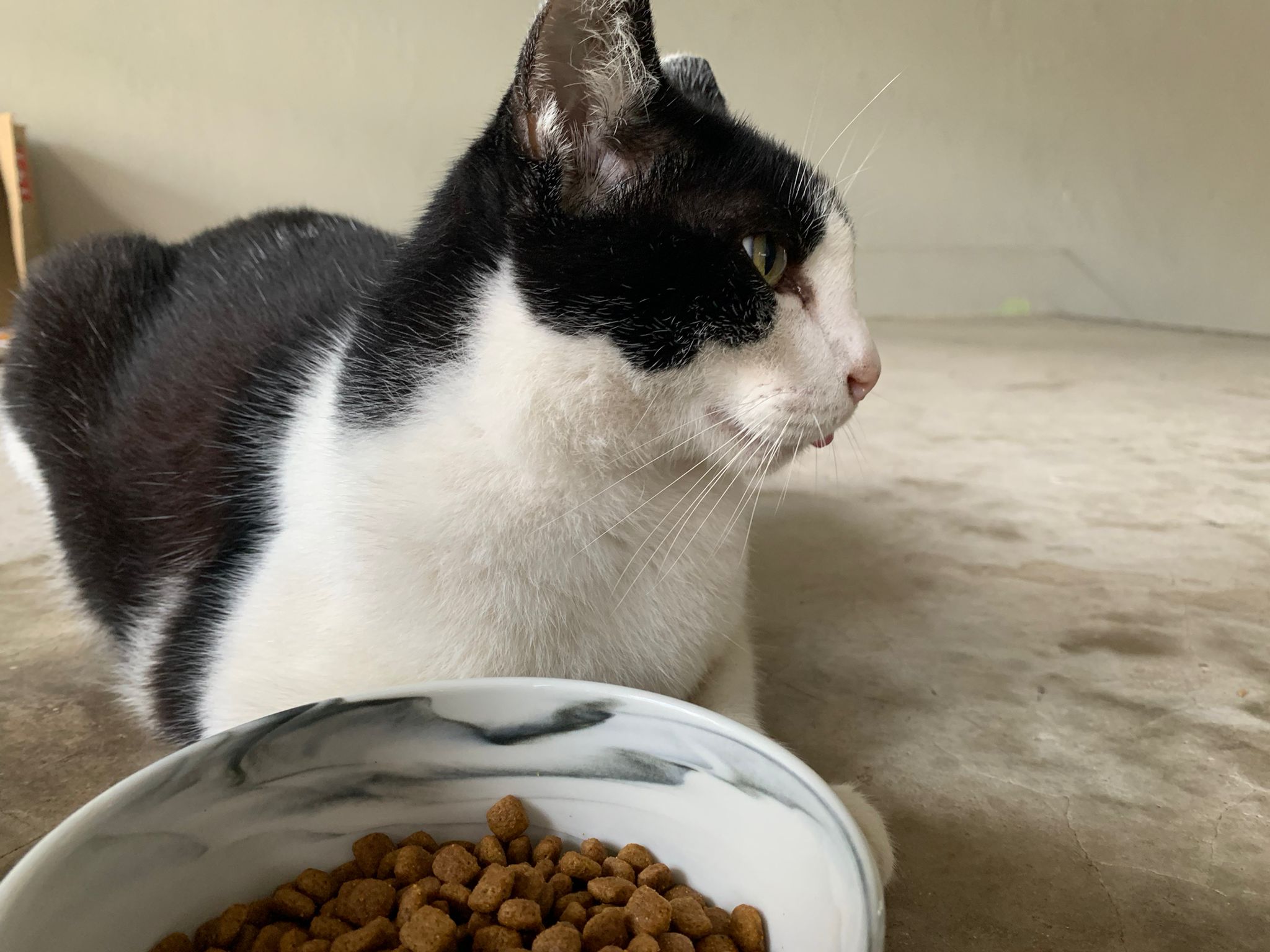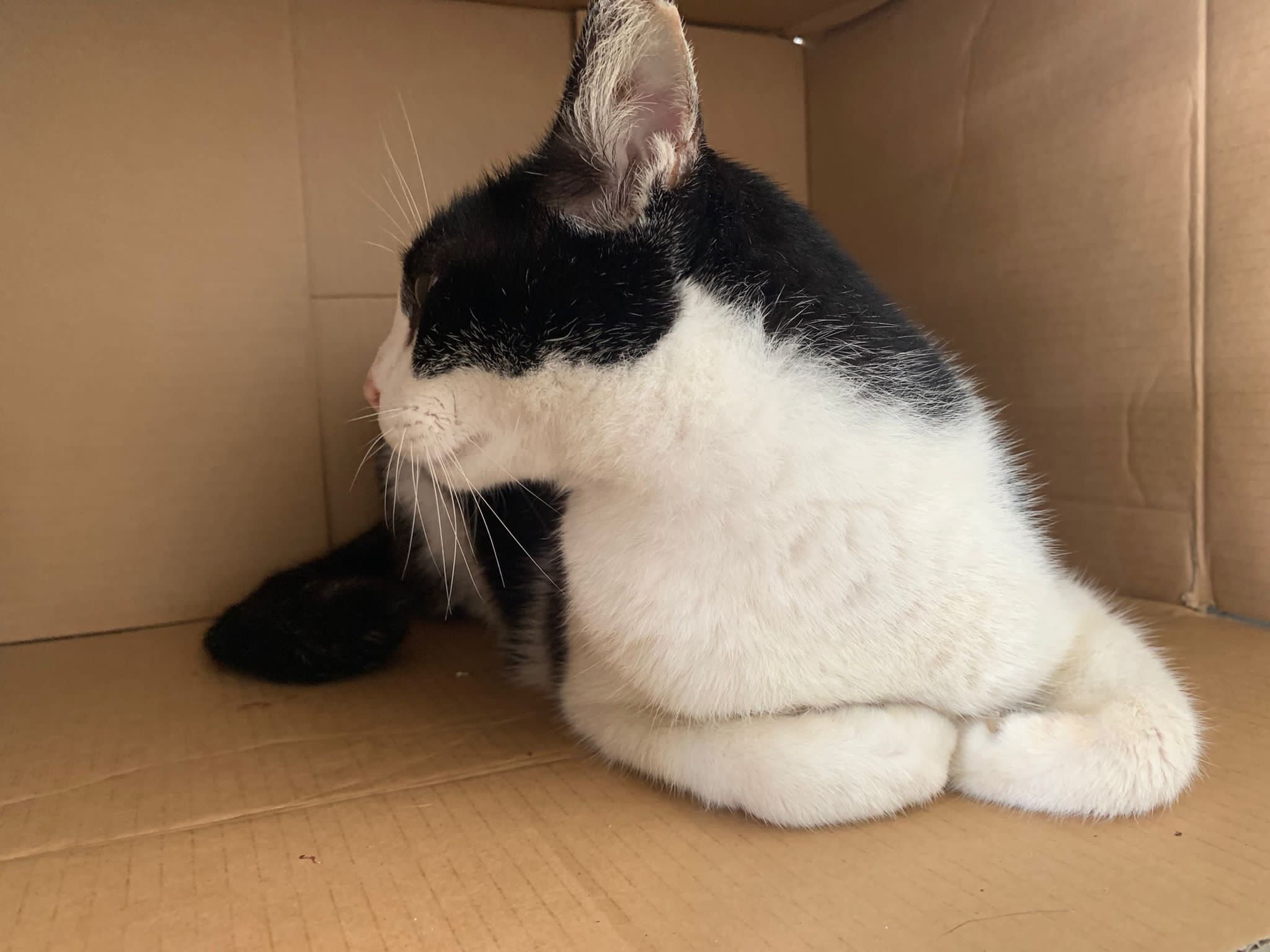 10pm+: super cute, xiao Lian like to hide and sleep in box too. Someone left a box for him to sleep in. My kibble bowl is back 🙂 I top up more kibble for him 🙂 sayang him a lot.