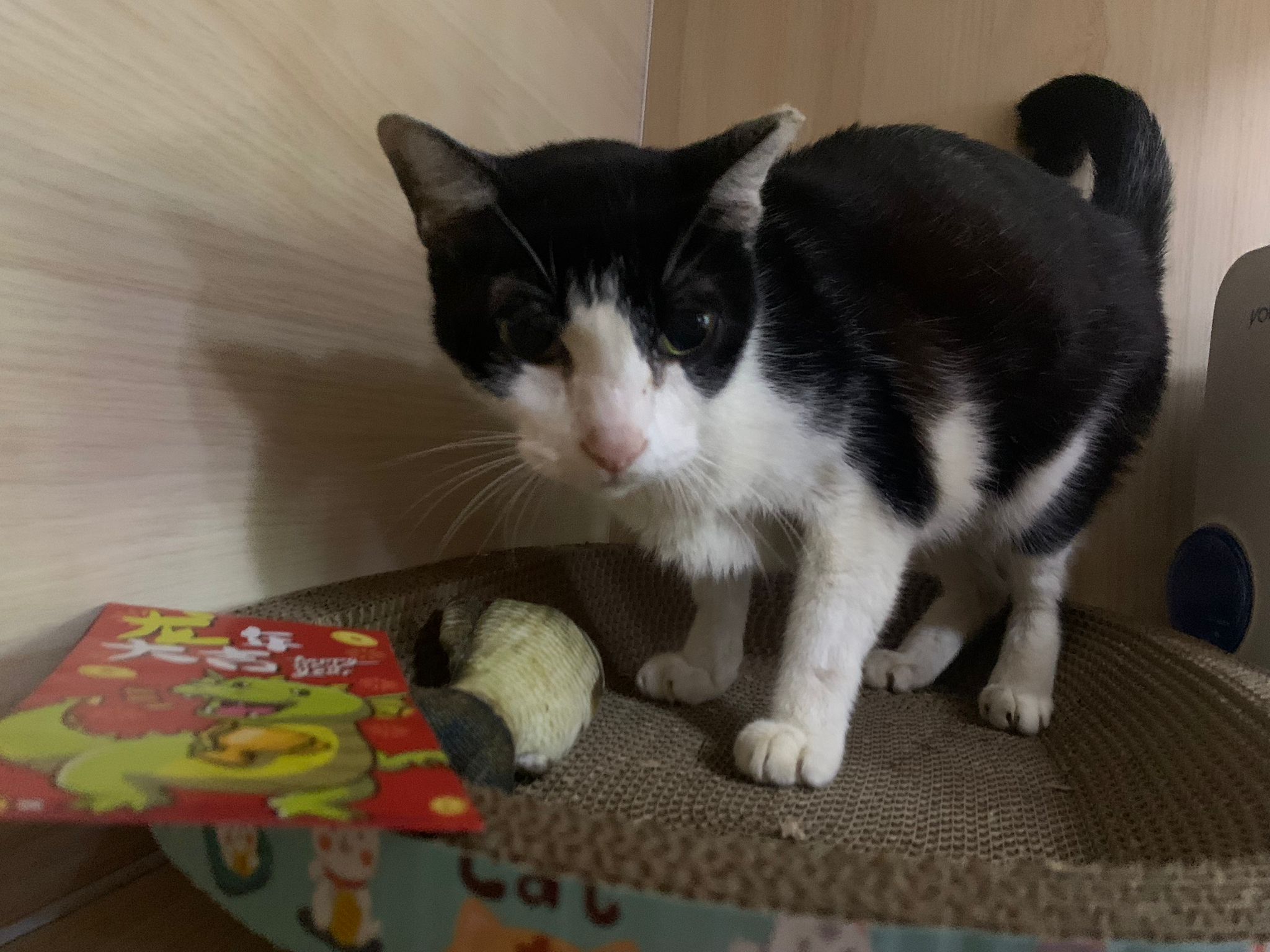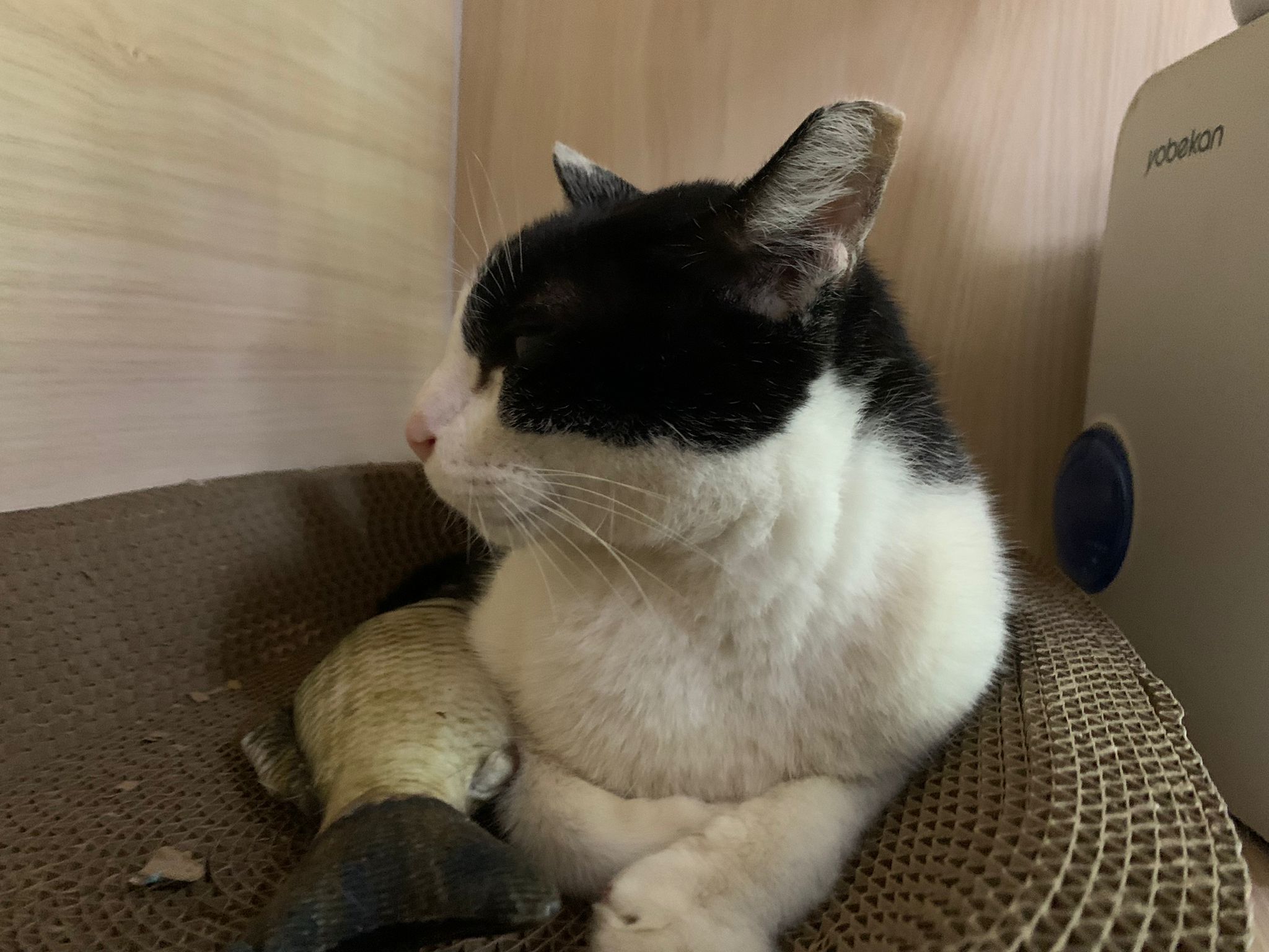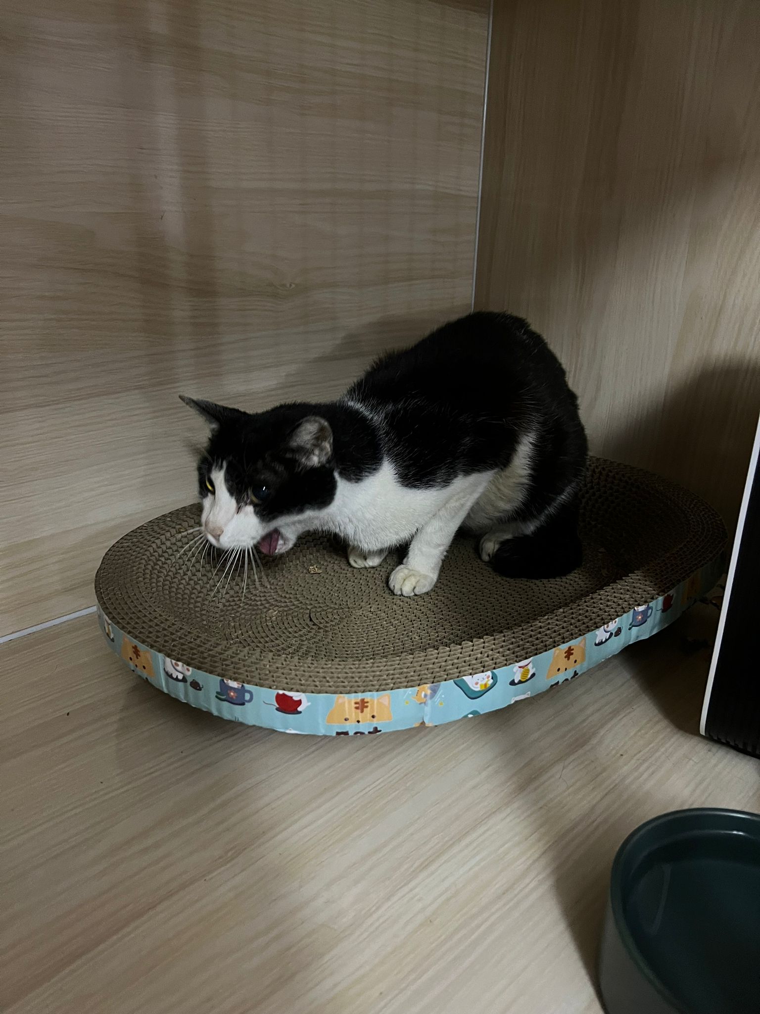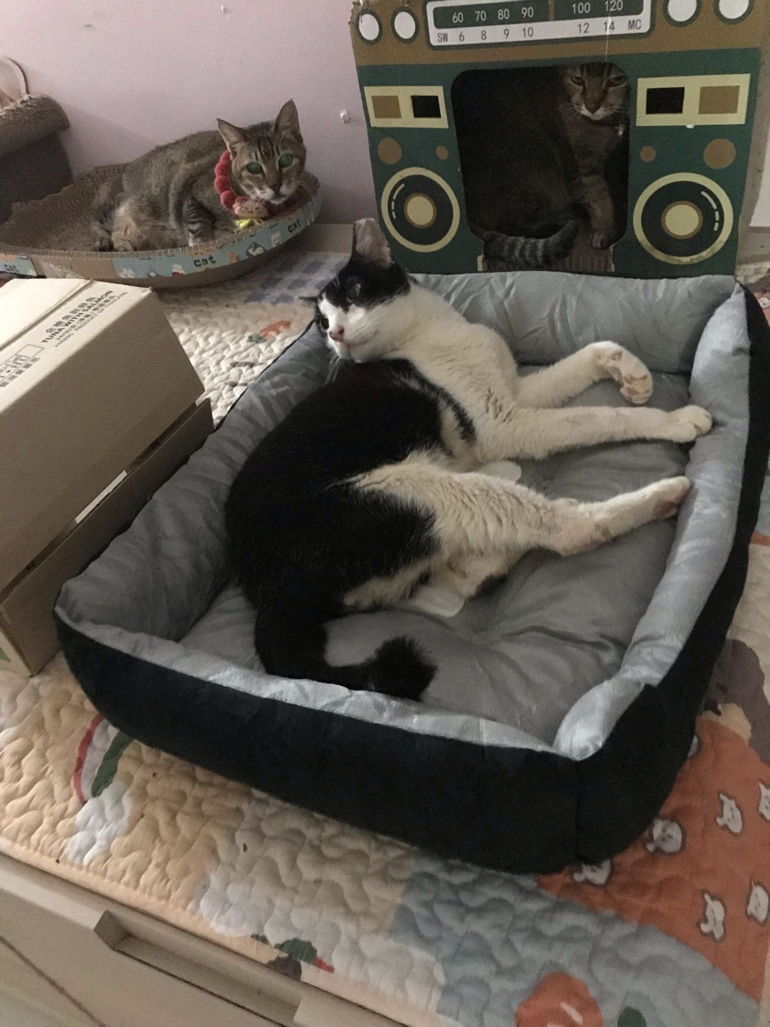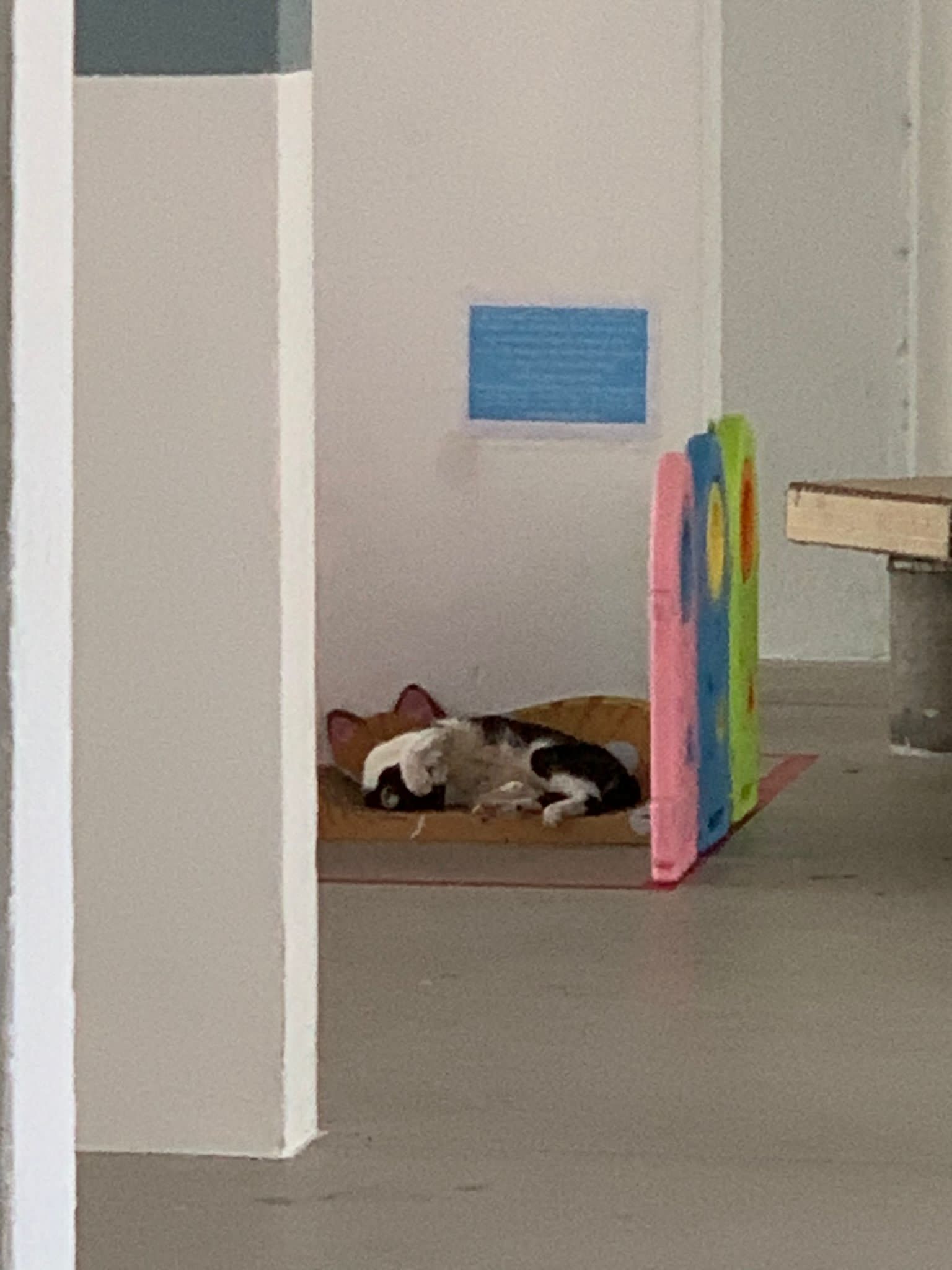 10pm+: super cute, xiao Lian like to hide and sleep in box too. Someone left a box for him to sleep in. My kibble bowl is back 🙂 I top up more kibble for him 🙂 sayang him a lot.
