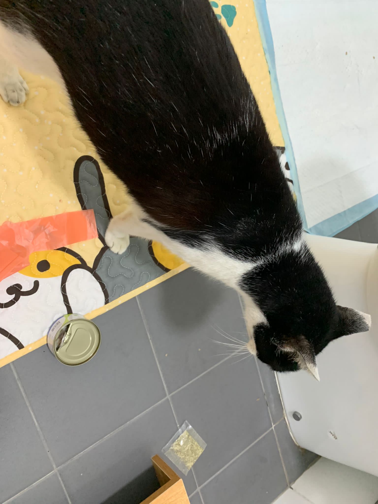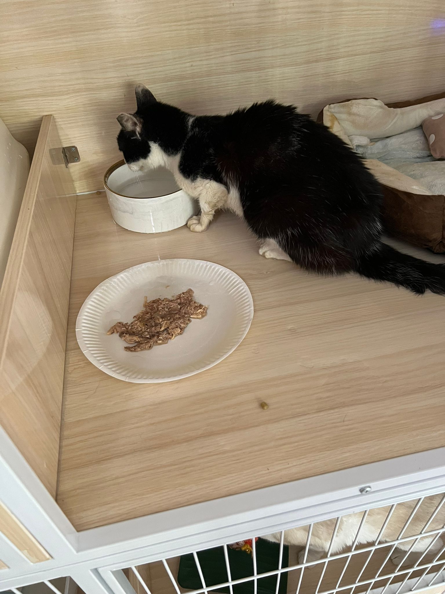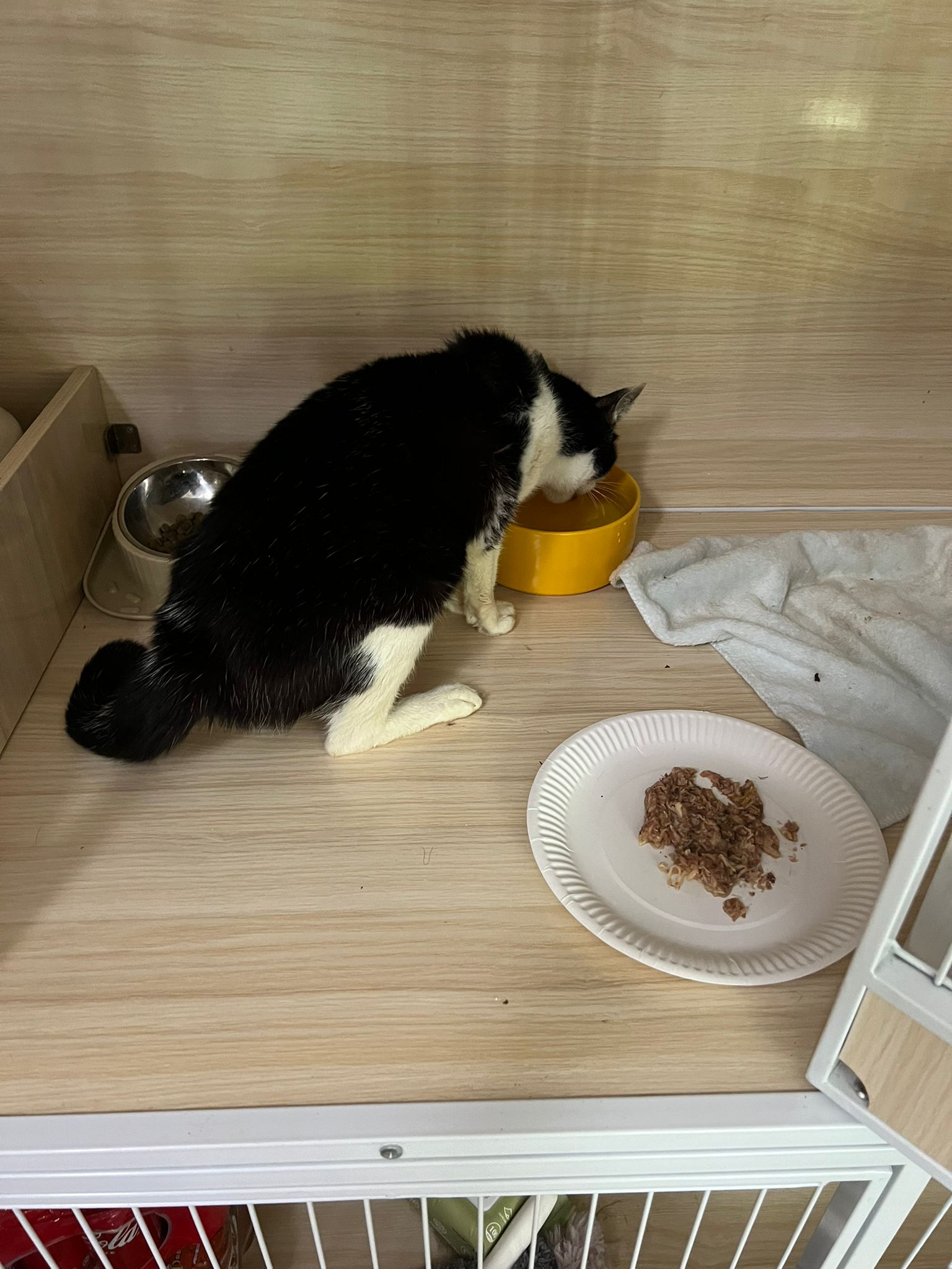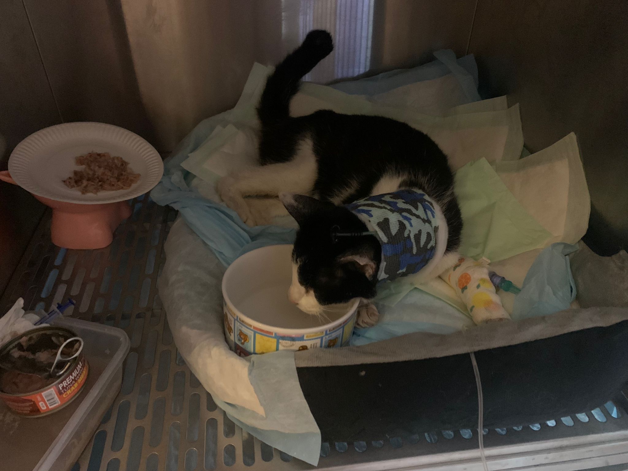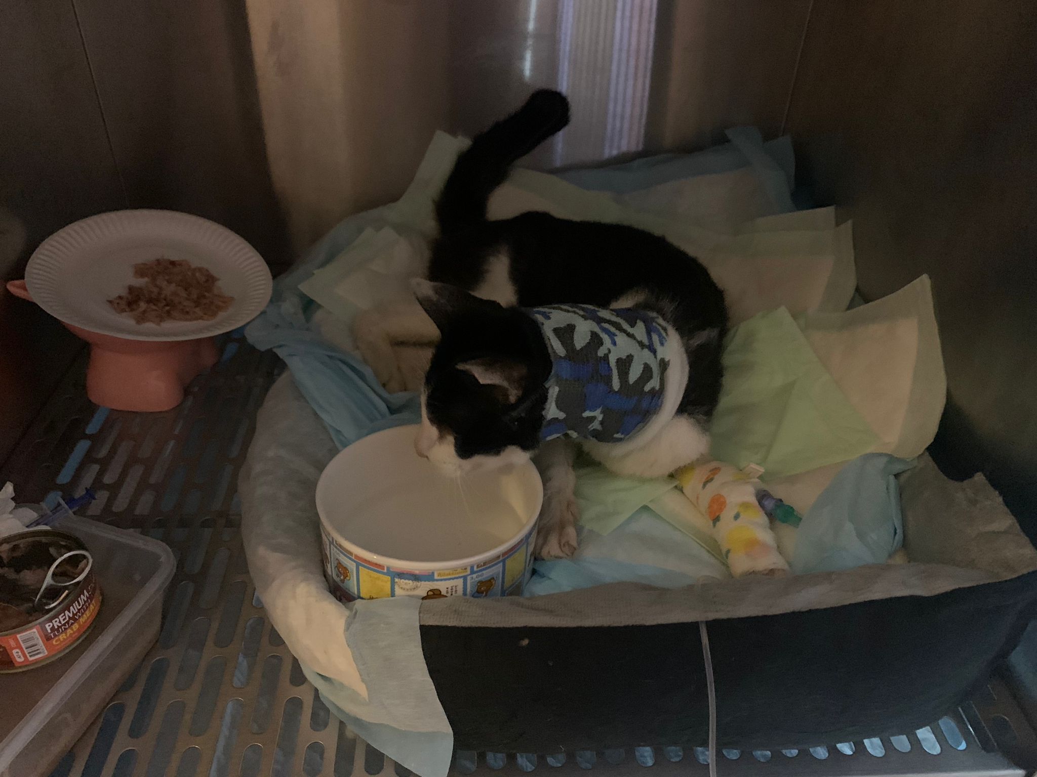 7am+: checked on him, he wake up and walk up. He topple water bowl. I serve a new bowl. He didn’t drink a lot. Lick a little but keep on it and at it till floor all wet. (Checked Google: sick I also know, anxious and stress – Erm give gaba will help, but same I need an o tube) told him again the plan, kiss him. Clear up and serve tuna w salmon. I set up hospi cage for him.
