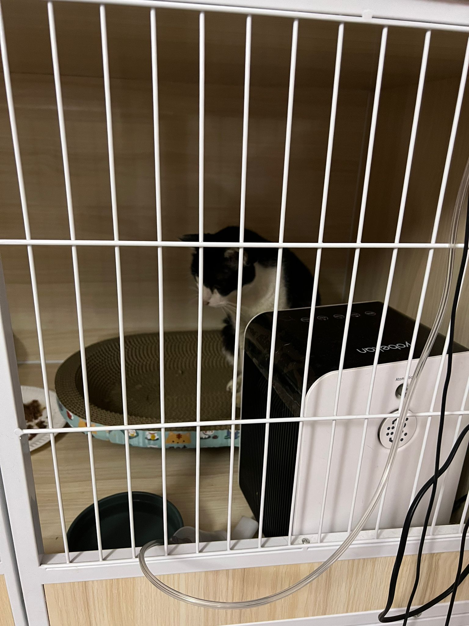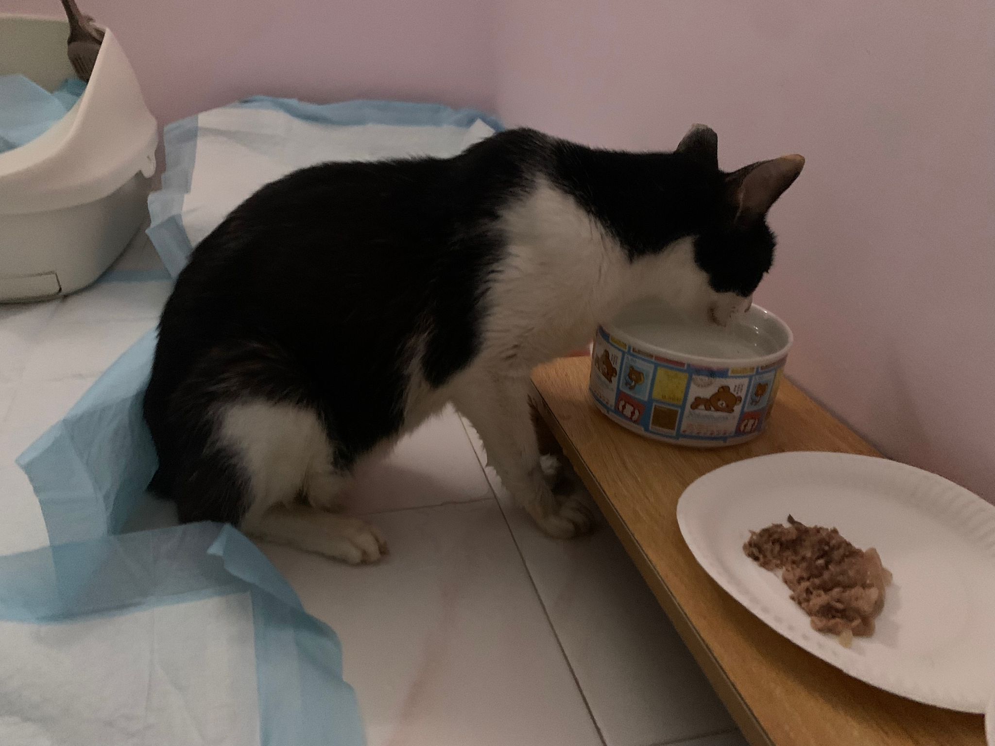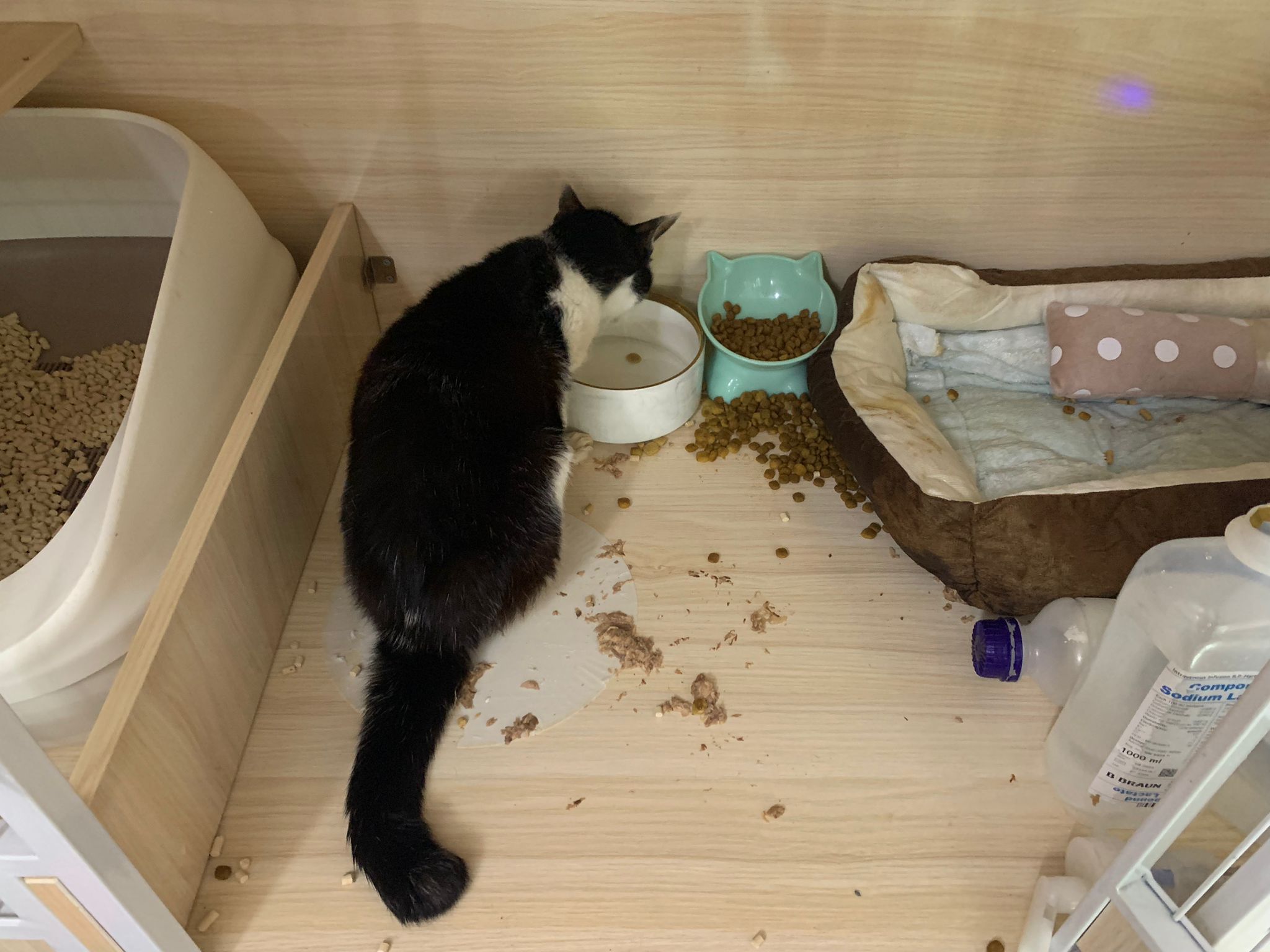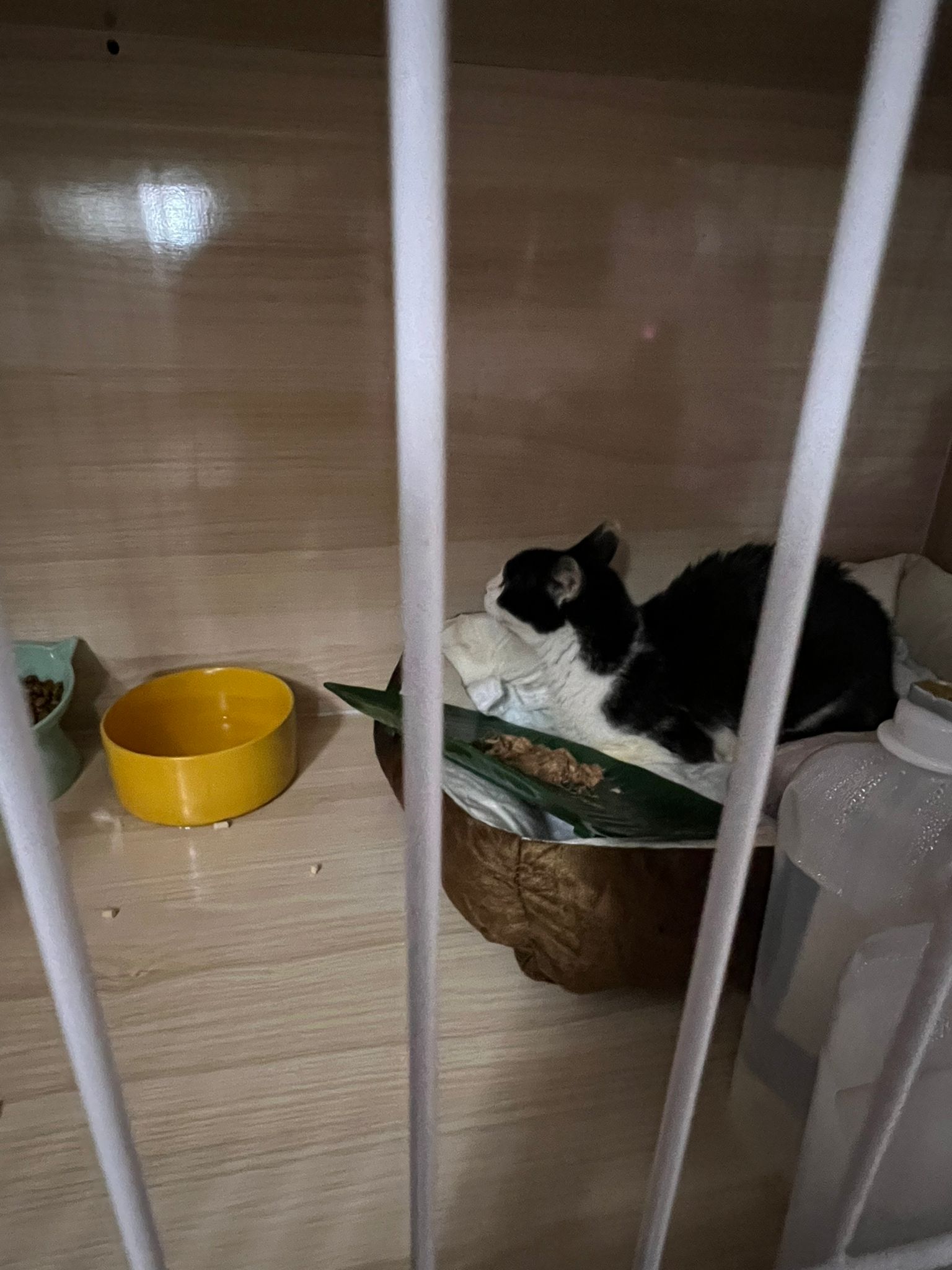 7am+: checked on him, he wake up and walk up. He topple water bowl. I serve a new bowl. He didn’t drink a lot. Lick a little but keep on it and at it till floor all wet. (Checked Google: sick I also know, anxious and stress – Erm give gaba will help, but same I need an o tube) told him again the plan, kiss him. Clear up and serve tuna w salmon. I set up hospi cage for him.