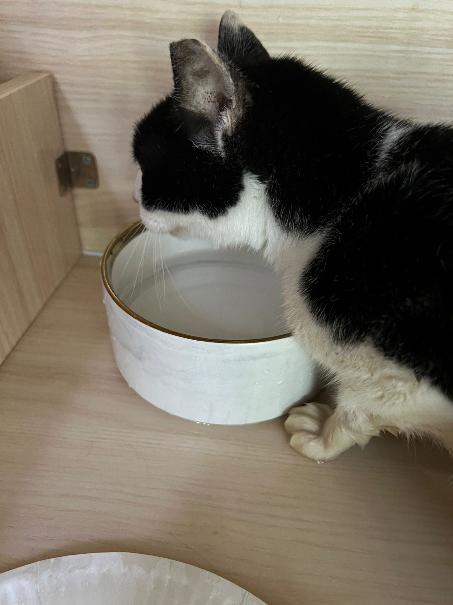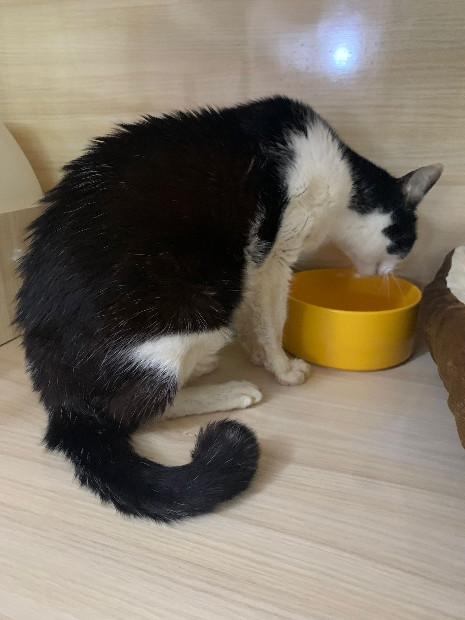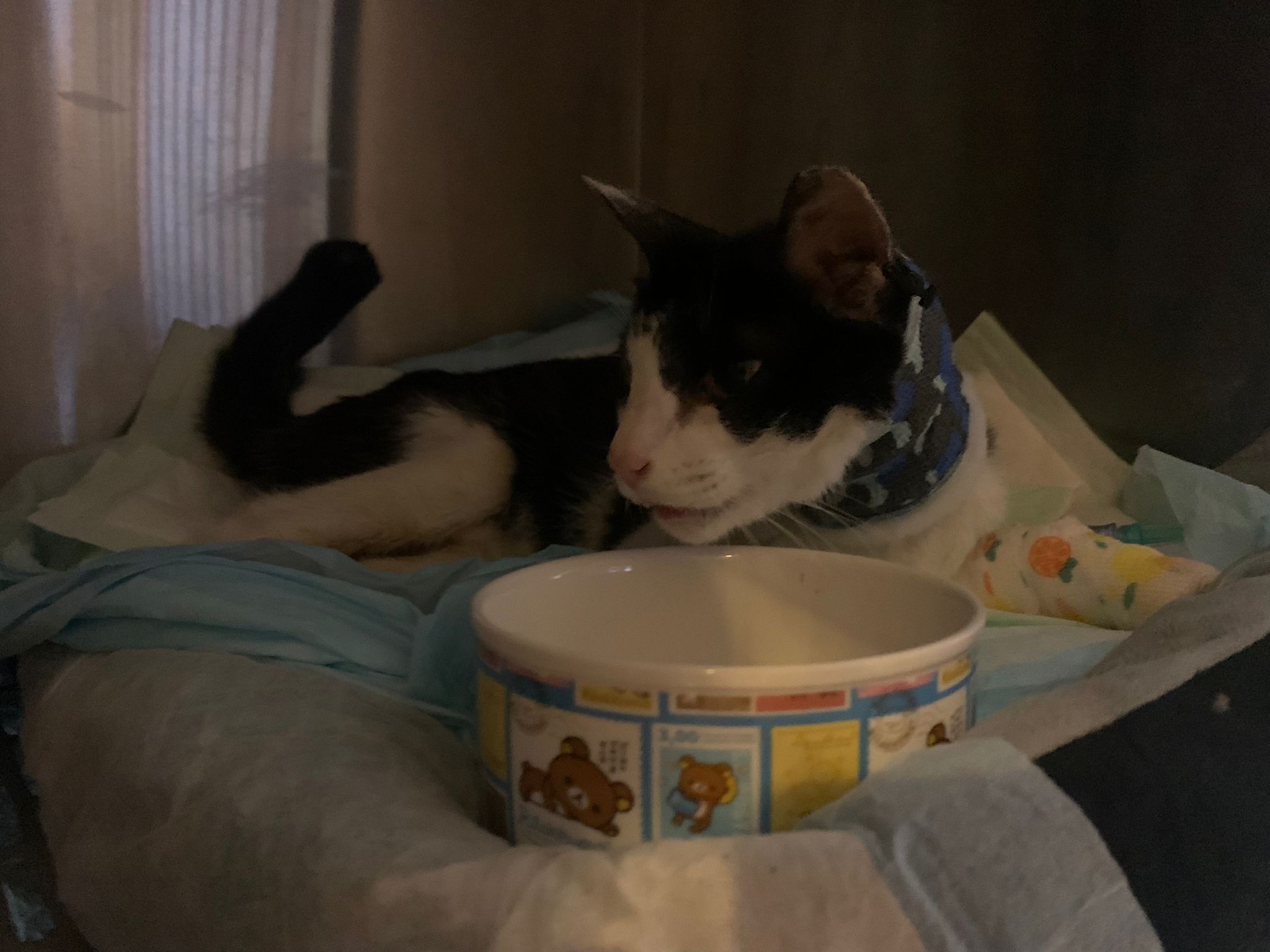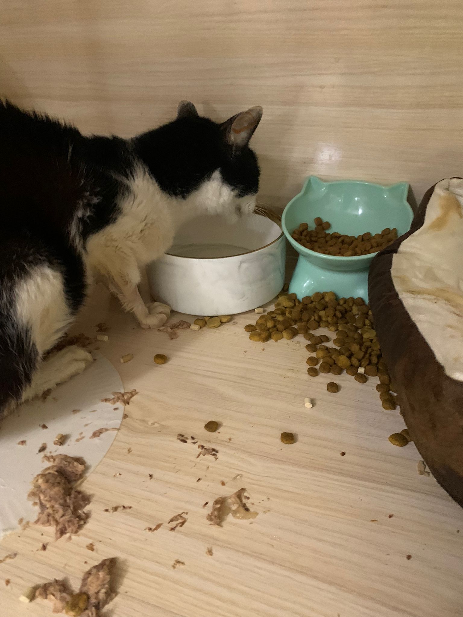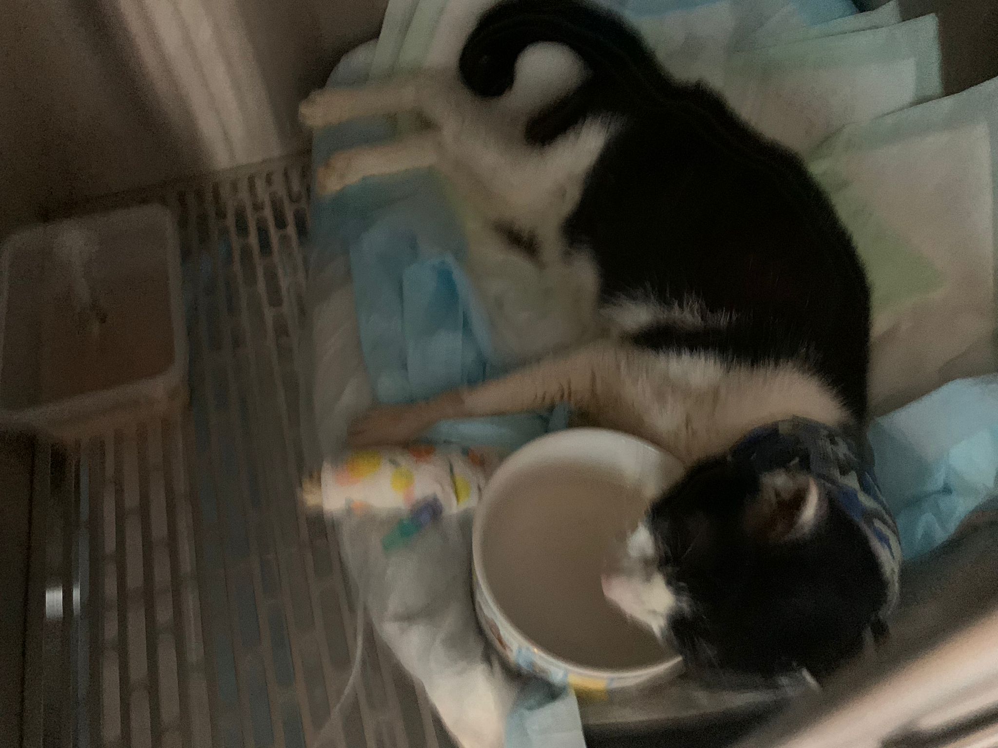 7am+: checked on him, he wake up and walk up. He topple water bowl. I serve a new bowl. He didn’t drink a lot. Lick a little but keep on it and at it till floor all wet. (Checked Google: sick I also know, anxious and stress – Erm give gaba will help, but same I need an o tube) told him again the plan, kiss him. Clear up and serve tuna w salmon. I set up hospi cage for him.