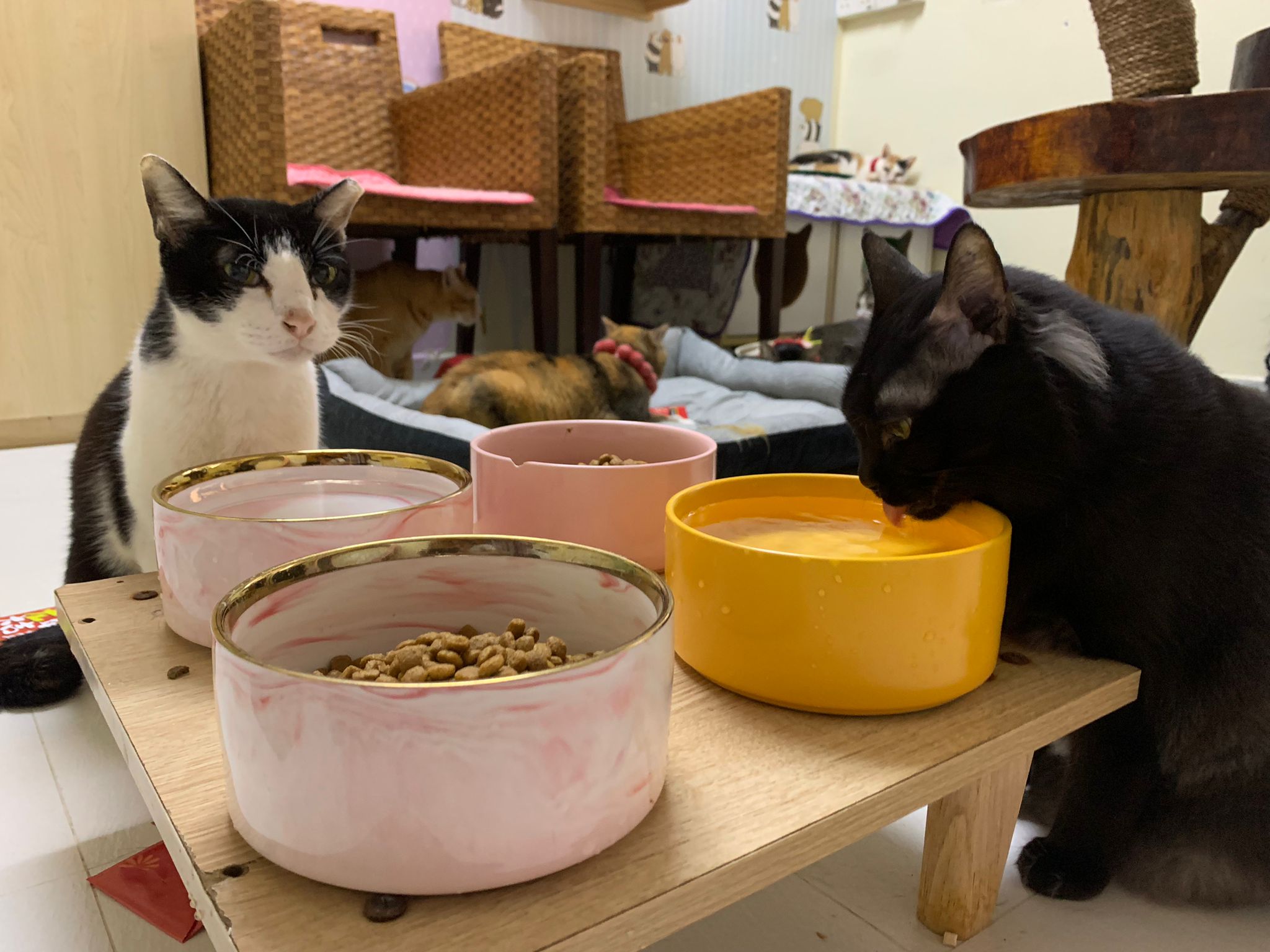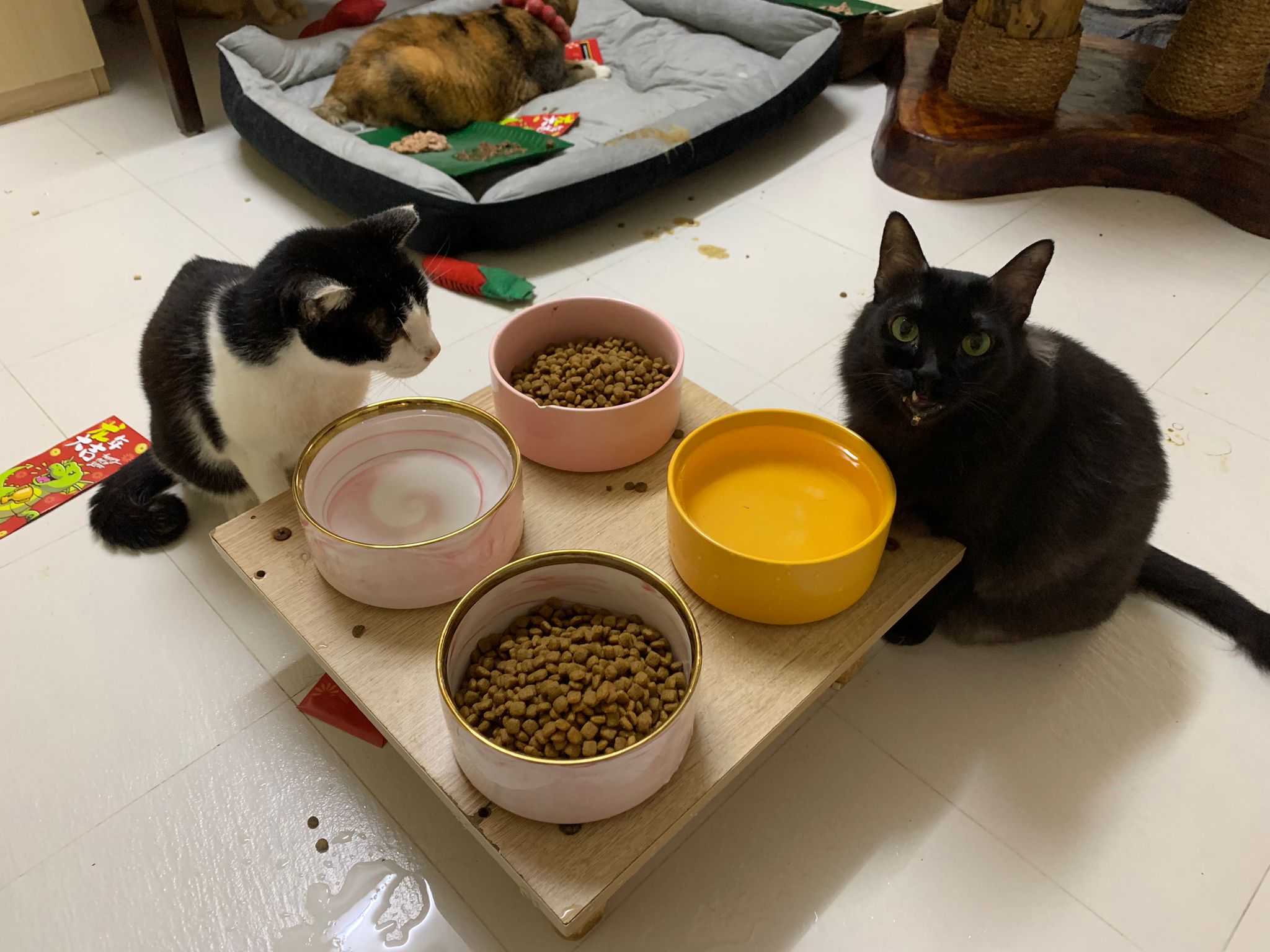 Serve aixia oldie. Serve Aristocats. Serve kibble and water bowl.