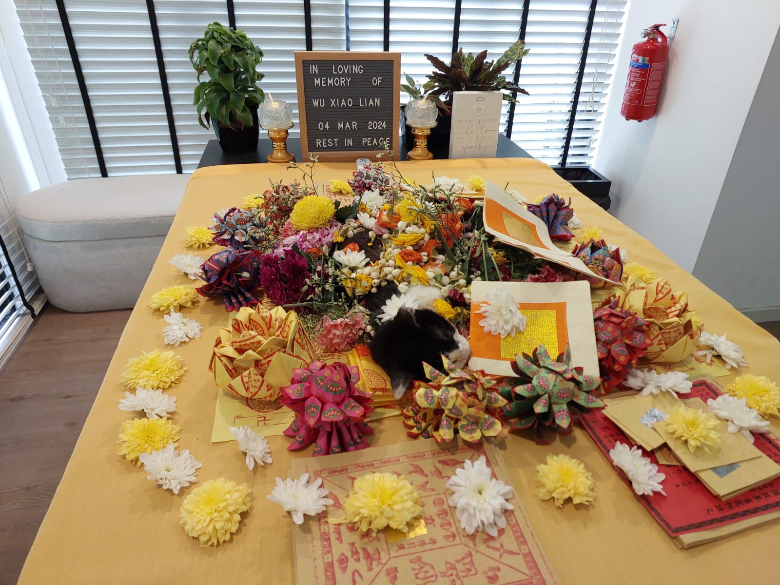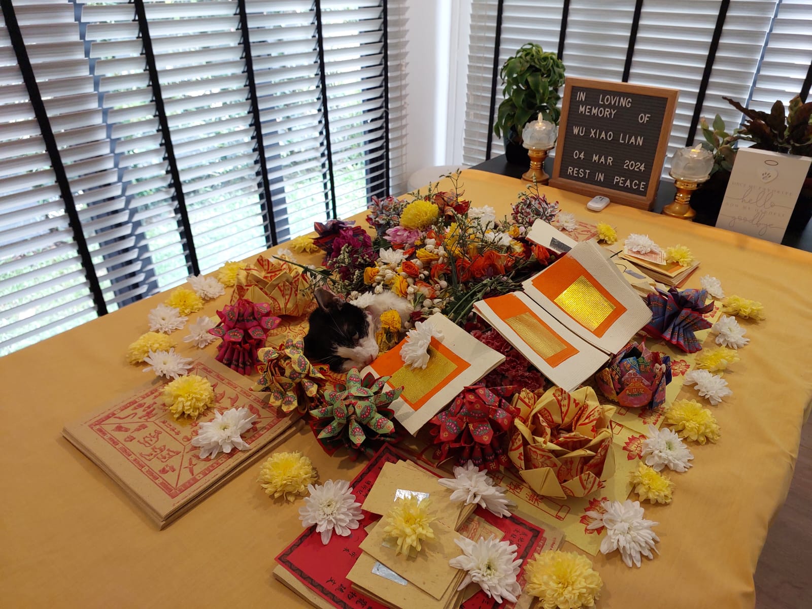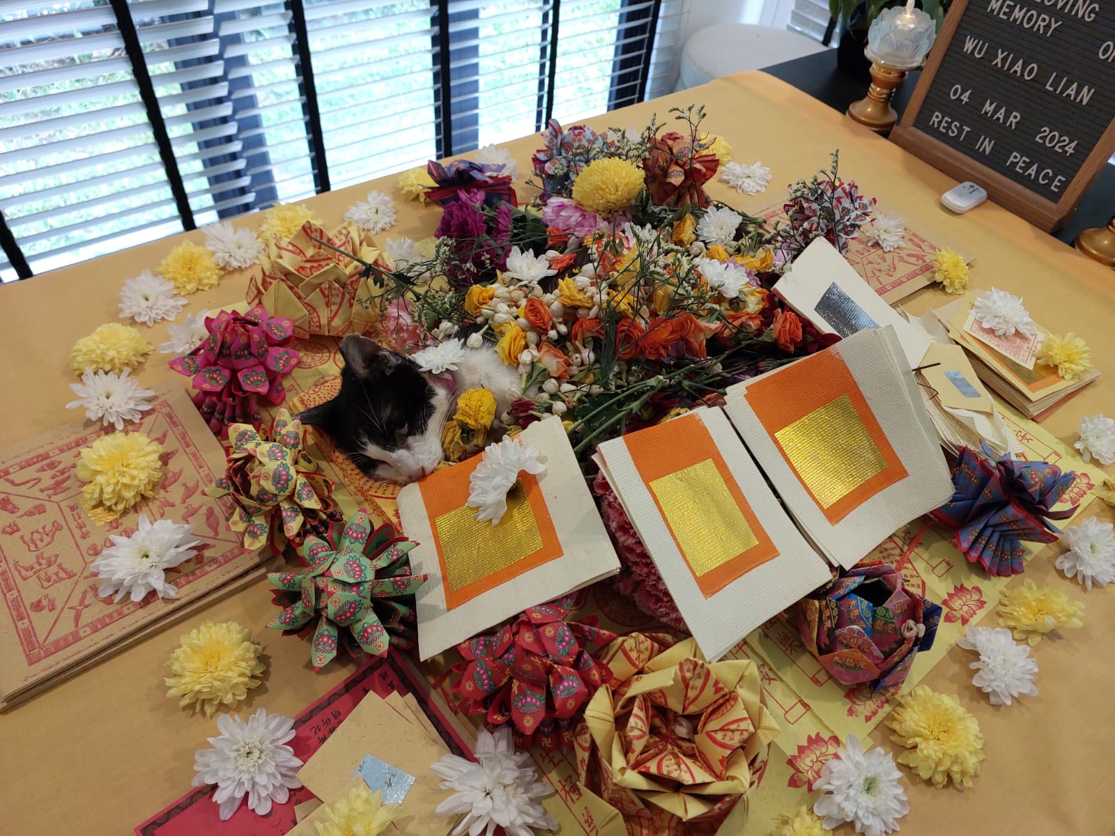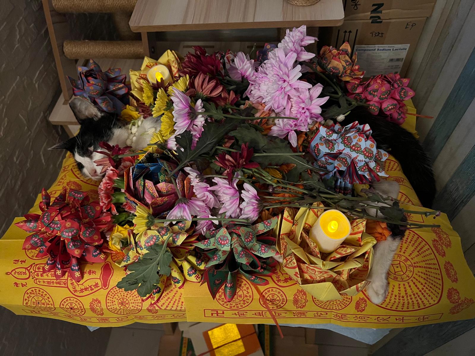 Agnes helped to call feeder fr morning till afternoon. I manage to get her at almost 2, she visit xl first. I shifted xl to Totoro room for his 9pm funeral. Tried to gather his fans and friends to say goodbye to him. forgot who came, jo, xl, cyn, 3 kids, mum, 2 lady w aunt, my 2 neighbours. Handsome lian lian can rest alr. He will move in w hei mao mao. I got to go n select his best 4 photos for urn alr. I’m dead. I still got lots of logbook to finish. I even forgot Kitty bday today. Sigh.