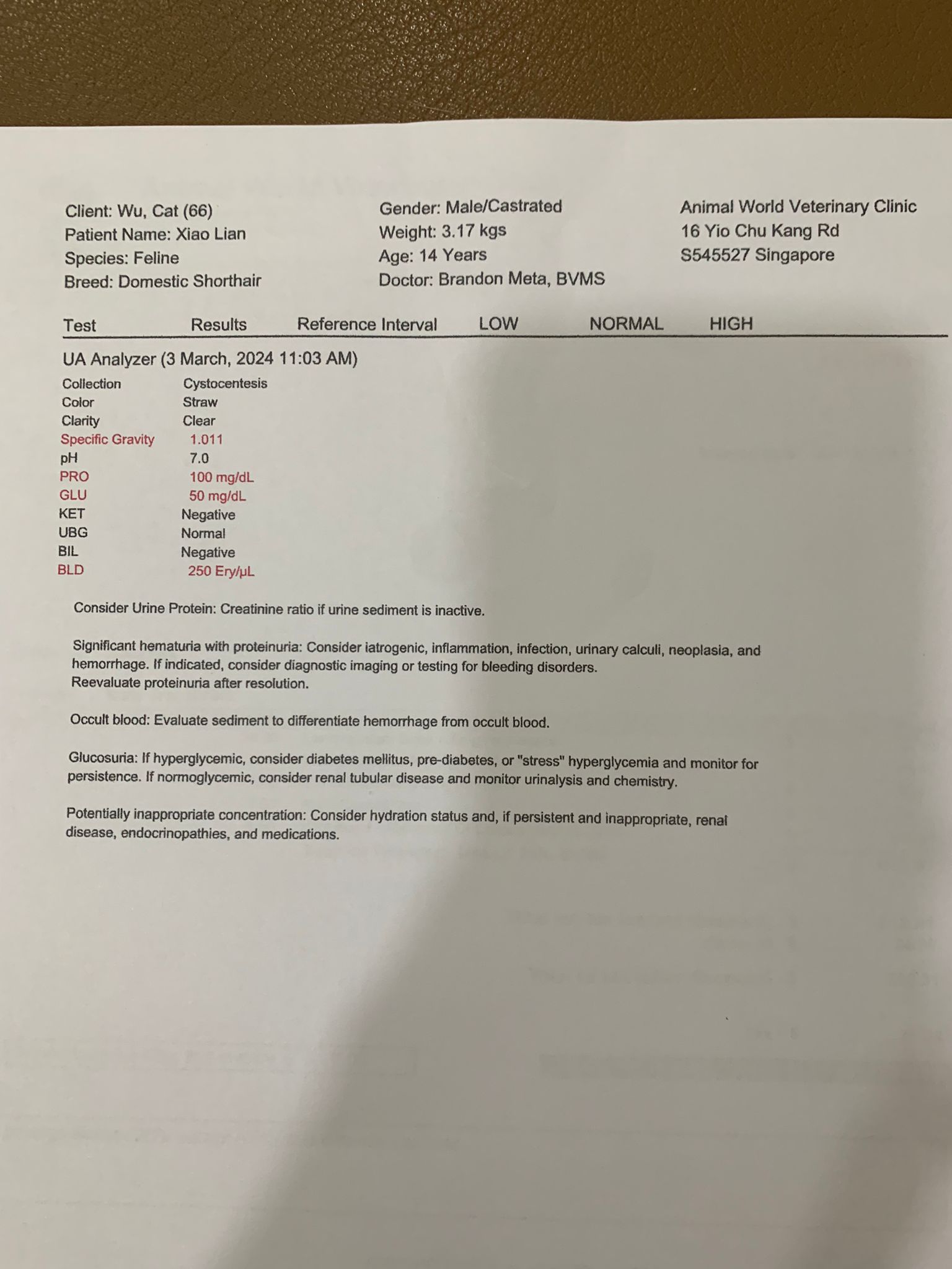 Sg 1.011, protein 100, glu 50. I don’t think he diabetic, but v stress bah.